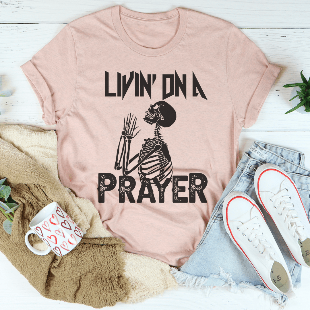 This t-shirt features a unique skeleton design that adds a touch of personality to your outfit. It's perfect for casual outings, music festivals, or simply lounging at home. Pair it with jeans, shorts, or even a skirt for a trendy look that showcases your individual style. The Living On A Prayer Skeleton Tee is versatile enough to be dressed up or down, making it a staple piece in any wardrobe.