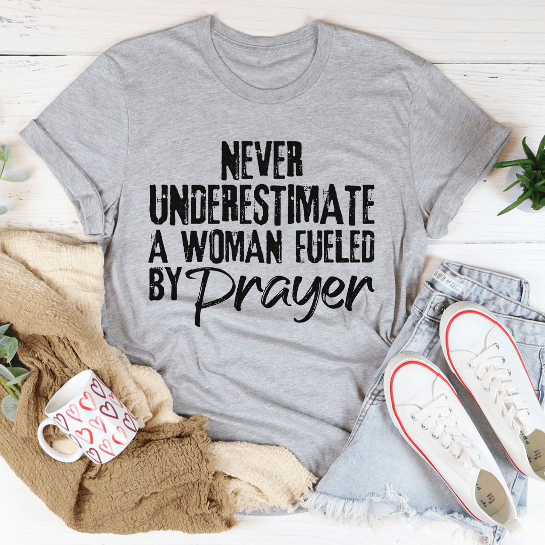 A stylish black t-shirt featuring the empowering phrase 'Never Underestimate A Woman Fueled By Prayer' in bold lettering.