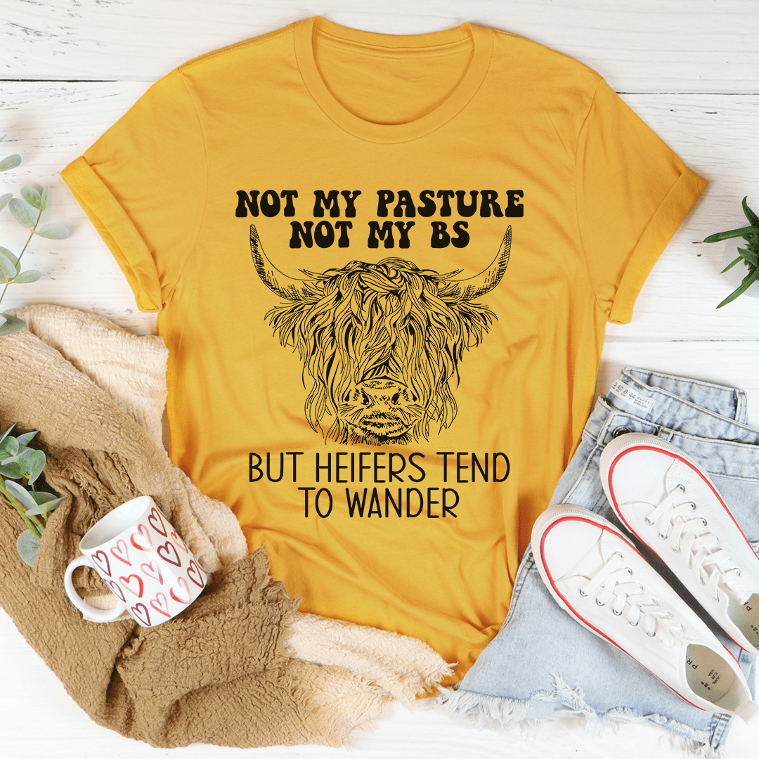 In summary, the Not My Pasture Not My BS But Heifers Tend To Wander Tee is a high-quality, stylish, and comfortable t-shirt that is perfect for anyone looking to add a fun and durable piece to their wardrobe. With its unique design, ethical production, and commitment to quality, this tee is sure to become a favorite in your collection.