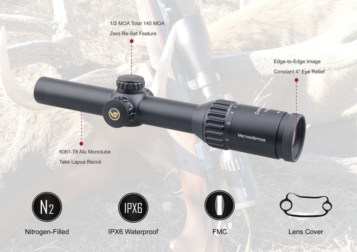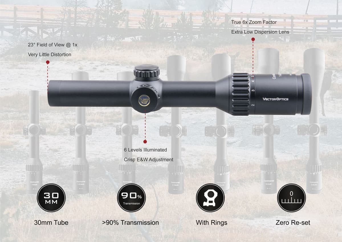 Here are some key specifications of the Optics Continental HD 1-6x24 Hunting Riflescope: