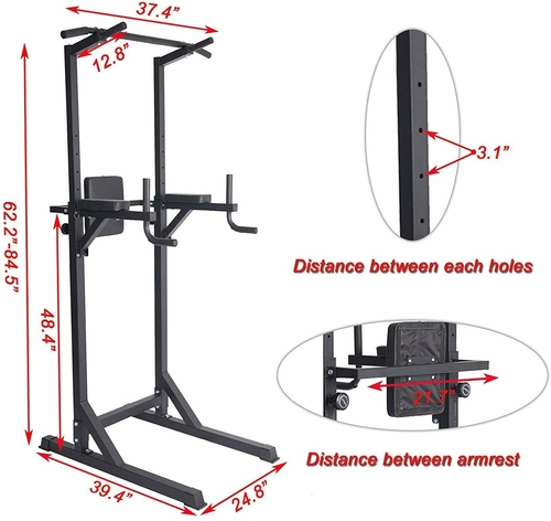 Multipurpose Dip Station Dimension: ( 62.2"- 84.5" ) H x 24.8" L x 39.4" W, Forearm cushion size: 3.9" W x 9.1"L, Backrest size: 9.4" W x 11.8" L