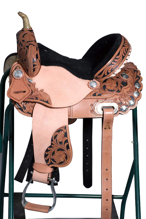 This beautiful pink cross saddle is a true one of a kind saddle package! This saddles features a hand carved floral tooling that is accented with a thick, smooth leather on the jockey flaps and fenders that give this set a two dimensional affect. This saddle also features an intricate hand stitched pink cross design that can be seen on the seat, pummel, and skirt of the saddle that make this set truly unique!