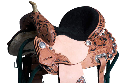 The over sized silver conchos, hand sewn silver beading, and two-tone crystal trim really make this saddle stand out and bling in the show ring. The seat is well-padded with a decorative quilt stitching on black suede for comfort and extra grip while riding. The underside is a well padded fleece for your horse's comfort.