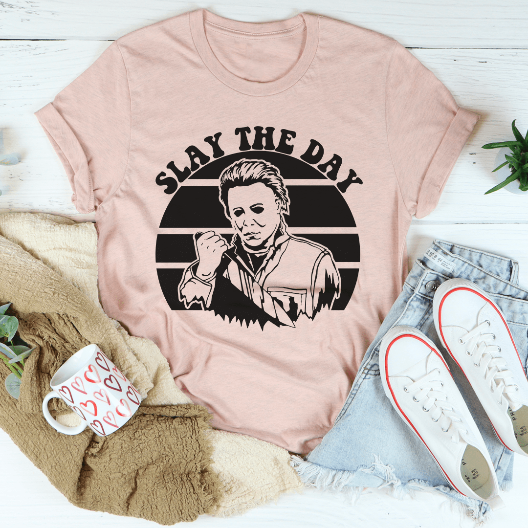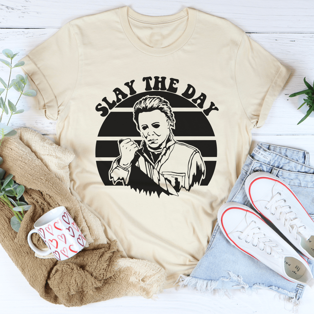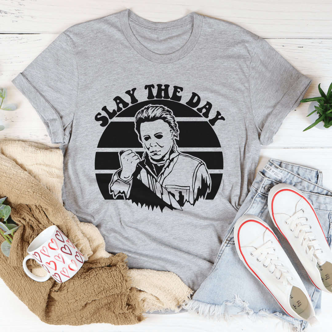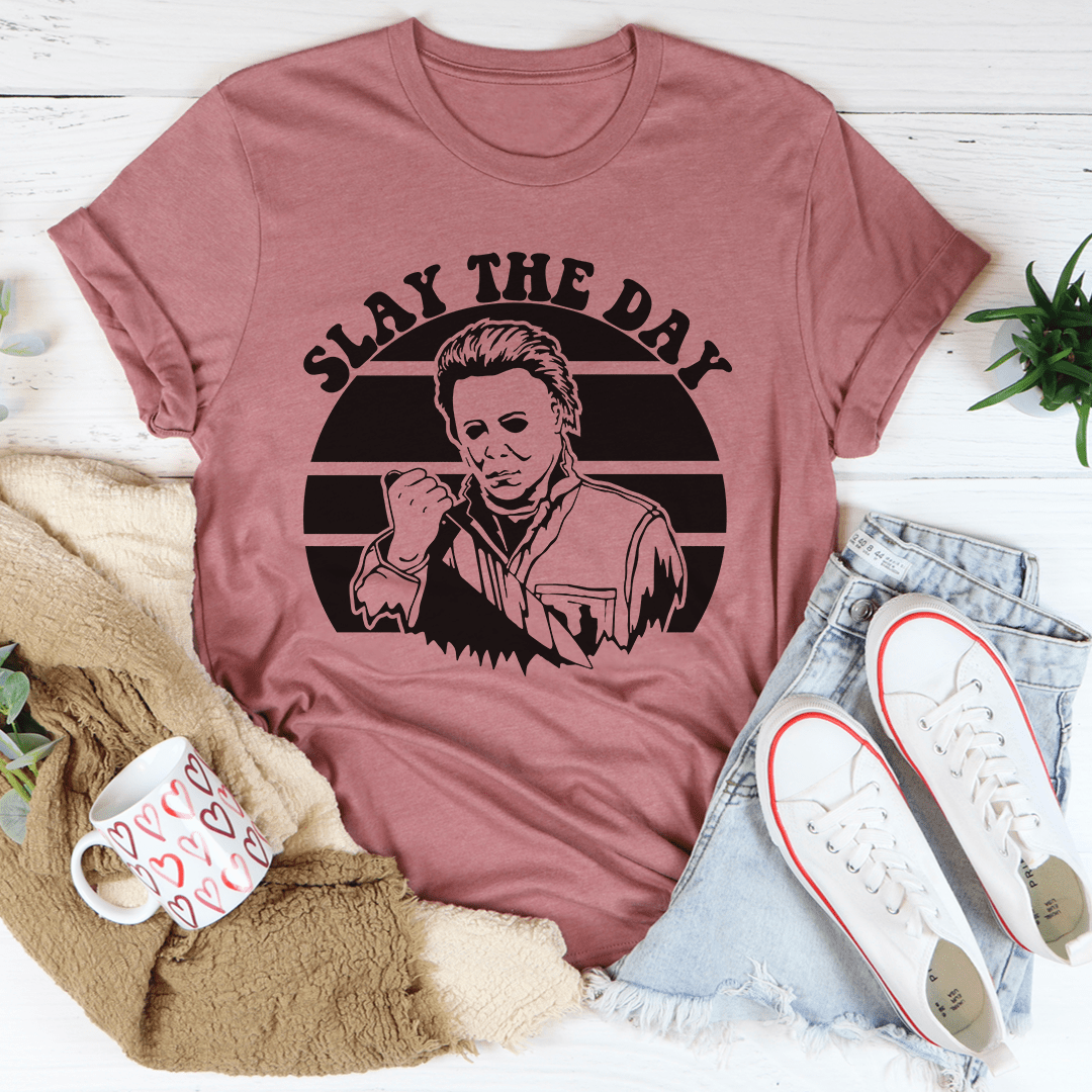 The Slay The Day Tee is not just a t-shirt; it's a versatile piece that can be styled in numerous ways. Pair it with your favorite jeans for a casual look, or dress it up with a blazer for a more polished outfit. Its simplicity allows it to be a blank canvas for your personal style, making it suitable for any occasion.