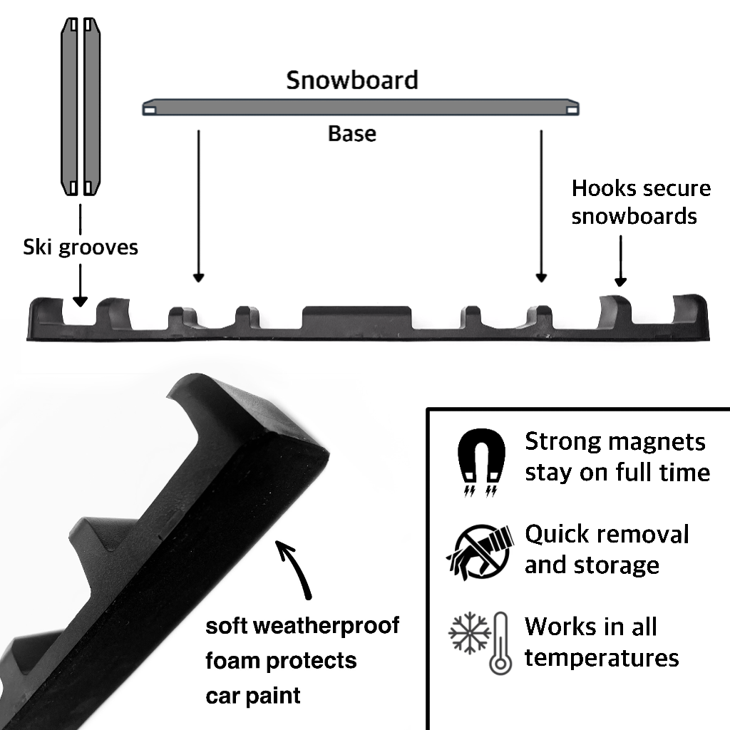 Introducing the revolutionary magnetic SnoStrip™, a must-have accessory for any outdoor enthusiast looking to protect their vehicle and gear. This patent-pending product is designed to provide a hassle-free solution for transporting your skis, snowboards, and other outdoor equipment without the worry of damaging your car's paint. With its innovative magnetic design, the SnoStrip™ ensures a secure hold while you drive, even at highway speeds.