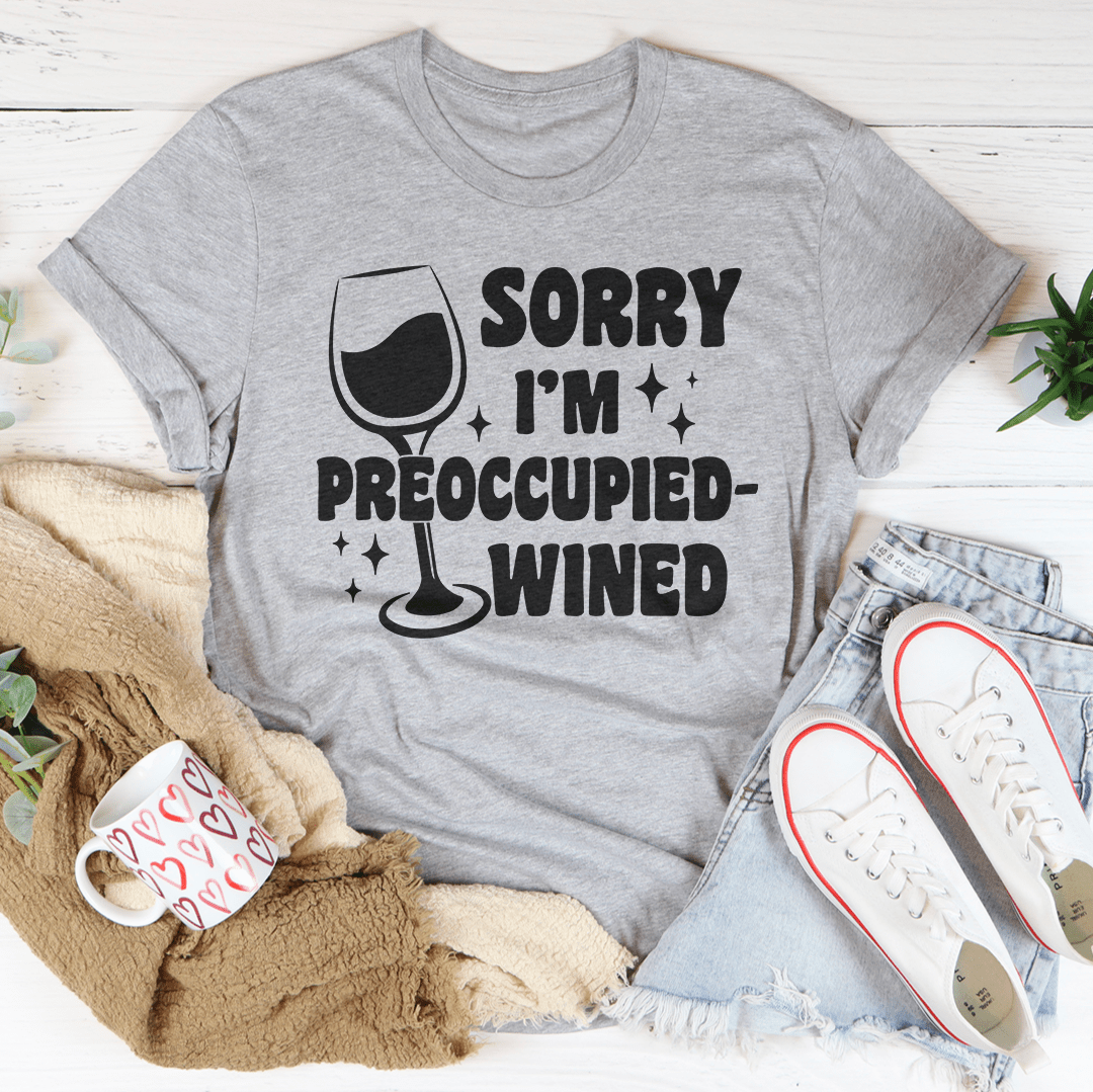 A stylish wined t-shirt with the text 'Sorry I’m Preoccupied' printed on it, showcasing its soft fabric and durable stitching.