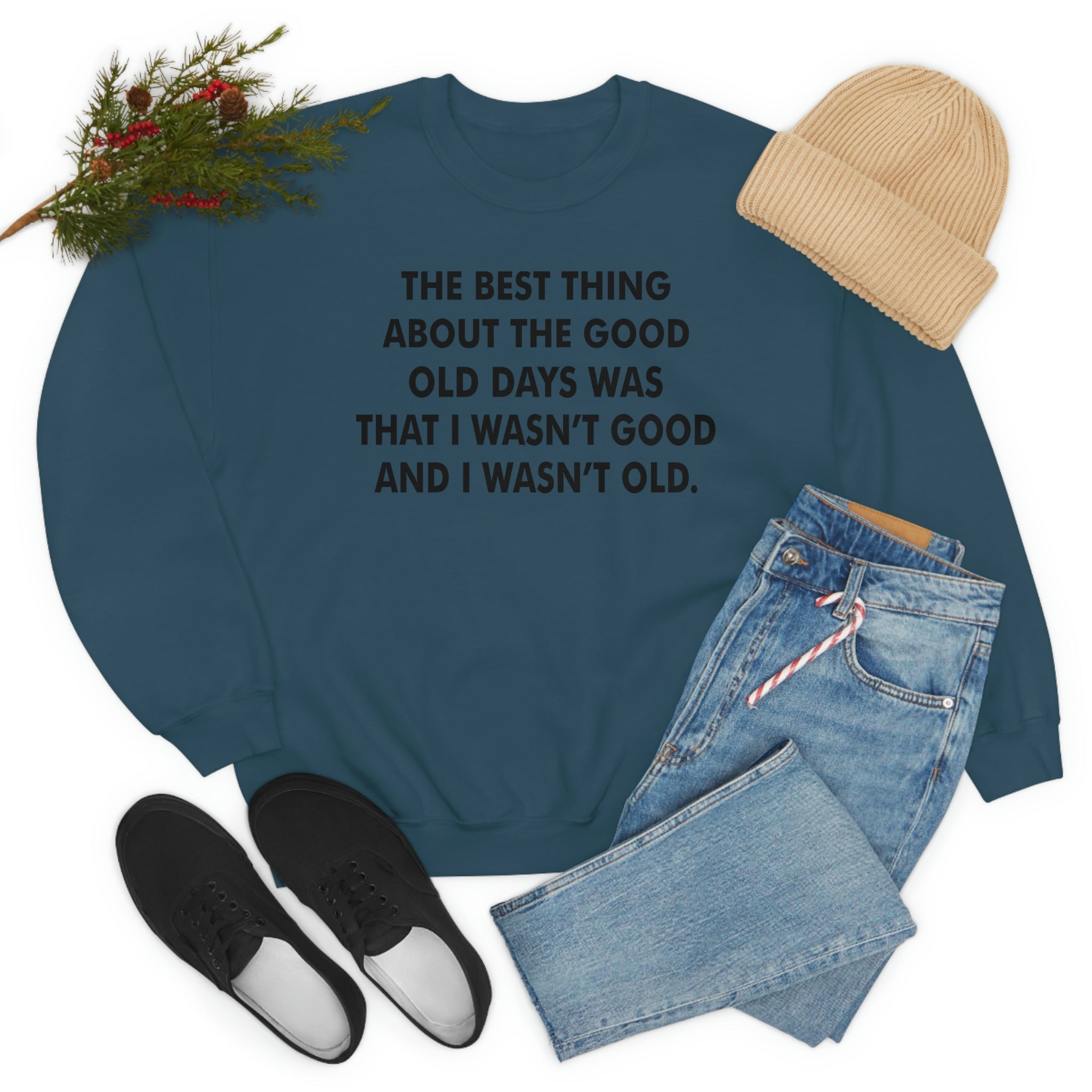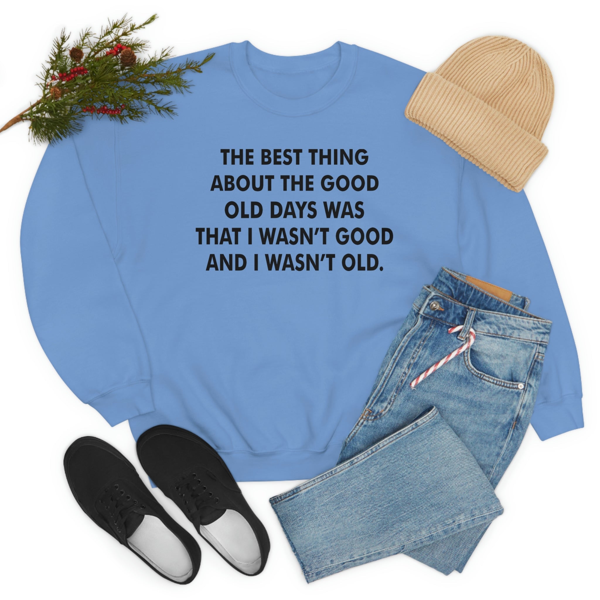 This sweatshirt is not just about comfort; it also boasts a stylish design that can be easily paired with various outfits. Whether you're dressing it down with jeans for a casual day out or layering it over a collared shirt for a more polished look, The Good Old Days Sweat Shirt is versatile enough to suit any occasion. Its timeless design makes it a great addition to any wardrobe.
