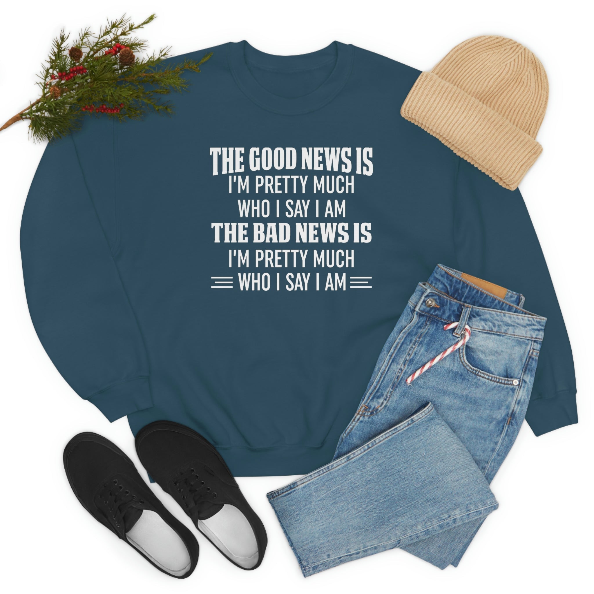 A cozy sweatshirt featuring the phrase 'The Good News Is I'm Pretty Much Who I Say I Am' in stylish print, made from soft ring-spun cotton.