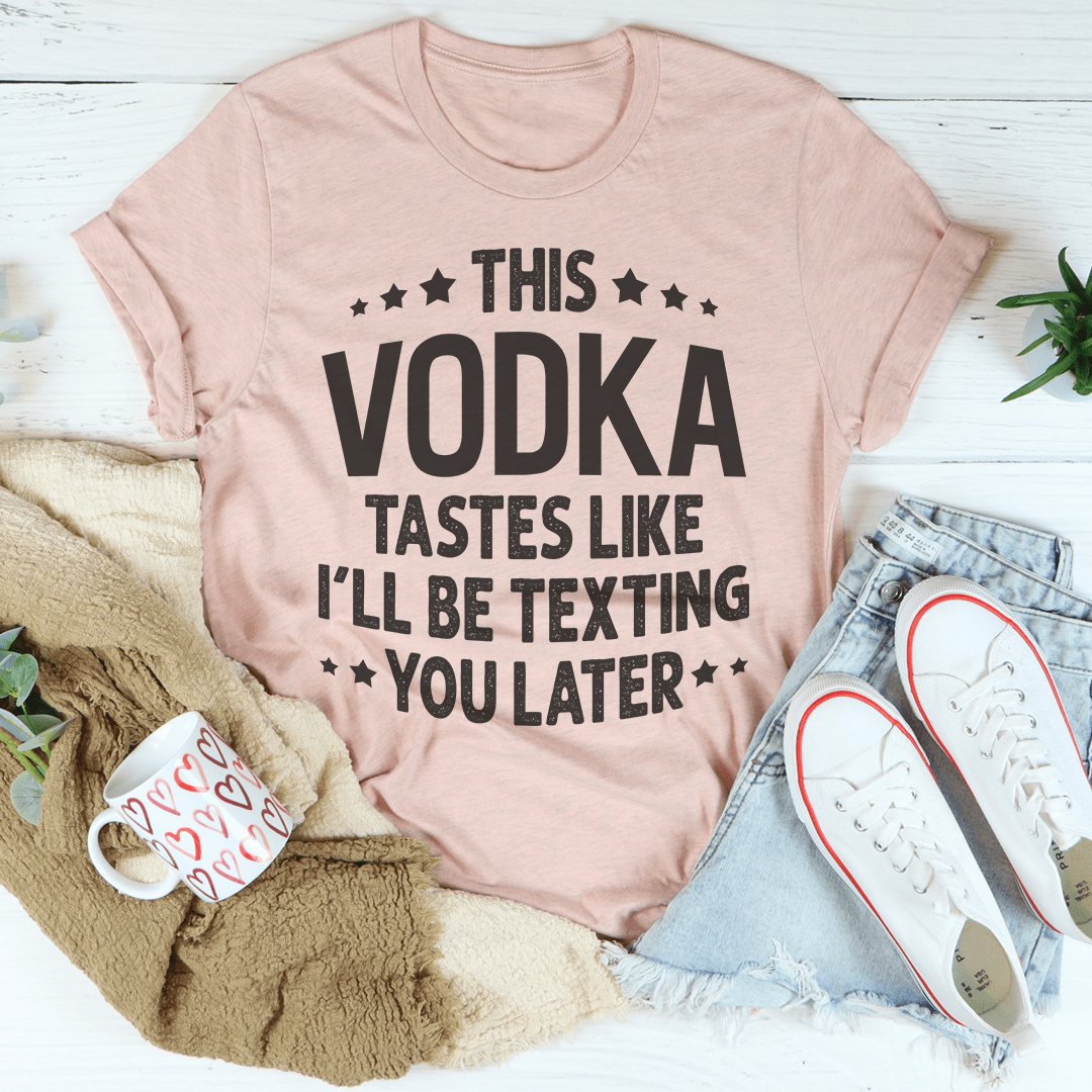 A stylish t-shirt featuring the phrase 'This Vodka Tastes Like I'll Be Texting You Later' printed on soft cotton fabric.