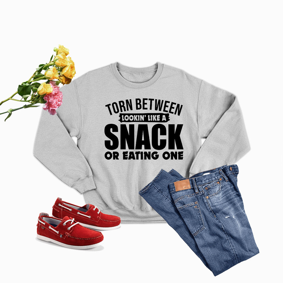 The 'Torn Between Lookin Like A Snack Or Eating One' sweatshirt is incredibly versatile. Pair it with your favorite jeans for a casual day out, or wear it with leggings for a cozy night in. Its stylish design makes it suitable for various occasions, from casual outings to relaxed gatherings with friends.
