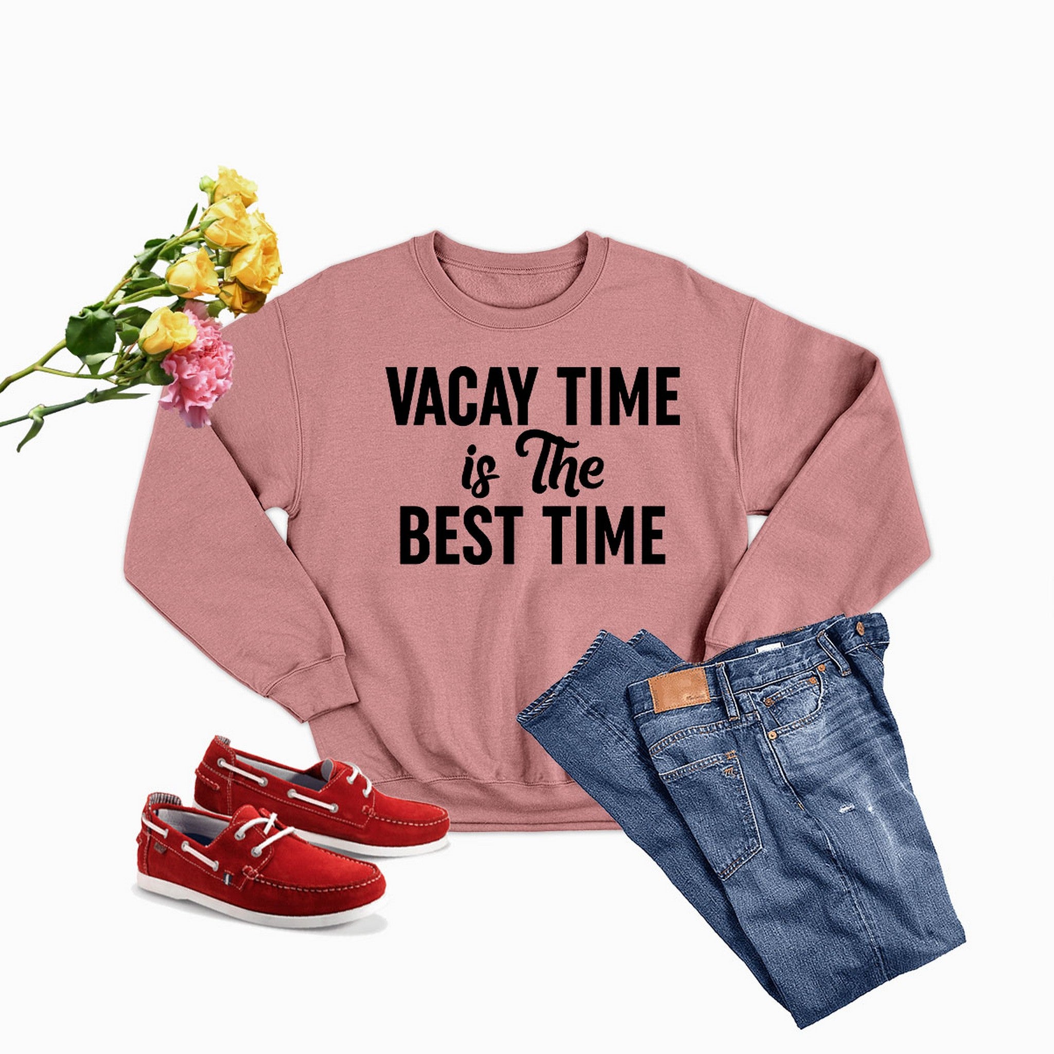 The Vacay Time Is The Best Time Sweat Shirt is not just about comfort; it also offers a stylish look that can be dressed up or down. Pair it with your favorite jeans for a casual day out, or wear it with joggers for a cozy night in. The versatility of this sweat shirt makes it a must-have for any wardrobe, allowing you to express your personal style effortlessly.