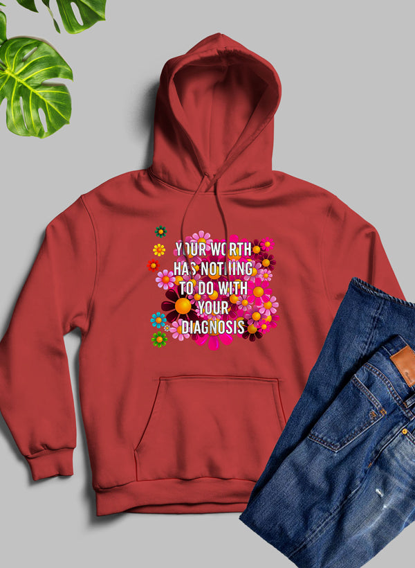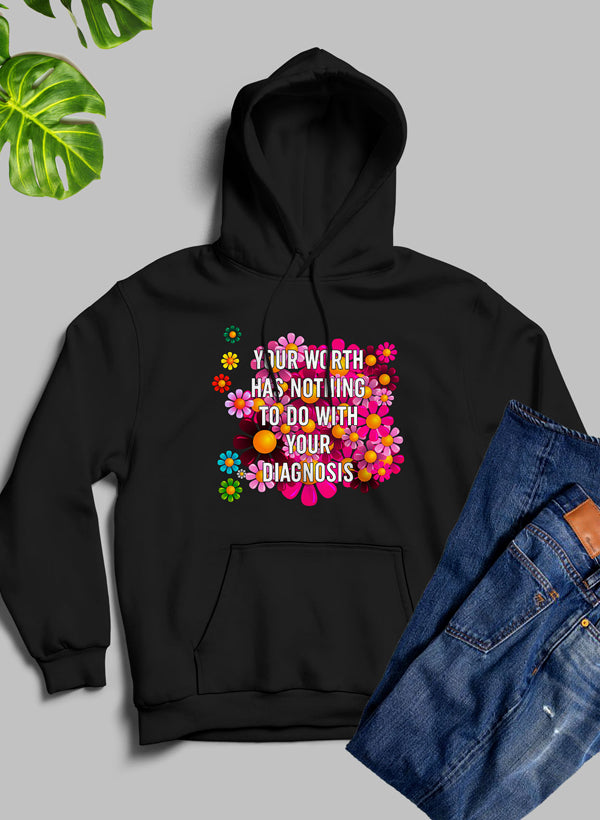 Choosing the 'Your Worth Has Nothing To Do With Your Diagnosis' hoodie means choosing comfort, style, and a meaningful message. It’s perfect for anyone who wants to express their individuality while supporting ethical fashion. Whether you’re buying it for yourself or as a gift for someone special, this hoodie is sure to be appreciated.