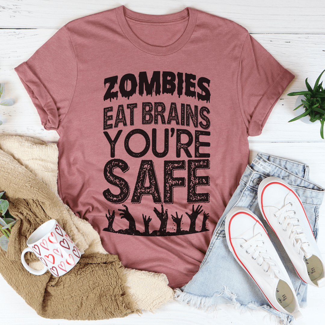Zombies Eat Brains You're Safe Tee featuring a playful zombie graphic on a soft cotton fabric.