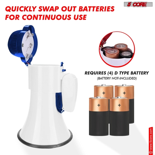 The 5Core megaphone is designed for portability, powered by 4 “D” type batteries (not included). This battery-operated design makes it perfect for use in locations without access to power outlets. Its lightweight construction and ergonomic folding handle, along with a convenient carry strap, ensure that you can transport it easily to any event or location.