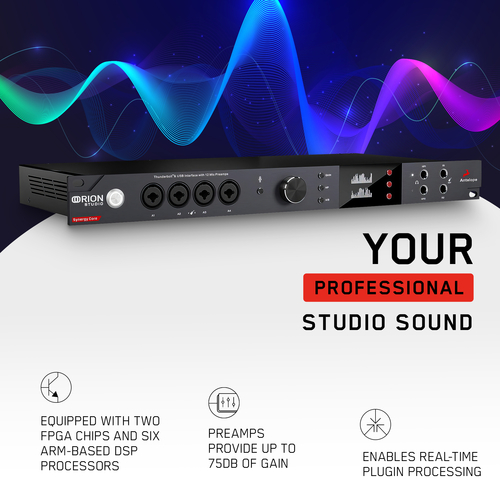 Orion Studio Synergy Core Thunderbolt 3 Interface and USB Audio Interface brings our recently pioneered Synergy Core FX processing platform to its next stage of evolution. With two proprietary Field Programmable Gate Array (FPGA) chips and a whopping six ARM-based DSP processors on board, the sheer computing power contained in this interface is astounding!