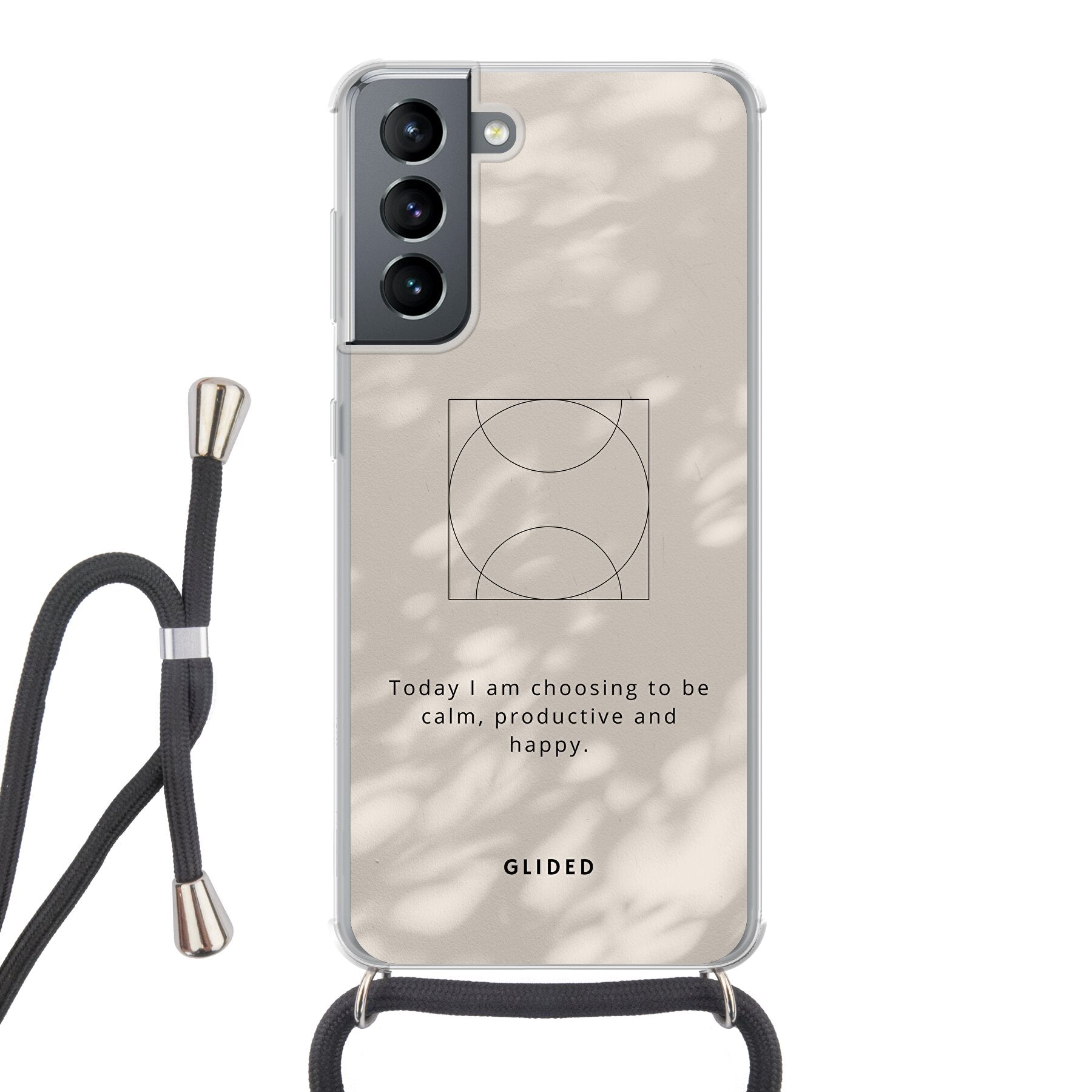 Entdecke die 'Affirmation' Handyhülle für das Samsung Galaxy S21 5G, die nicht nur dein Smartphone schützt, sondern auch eine tägliche Quelle der Inspiration bietet. Mit dem motivierenden Spruch "Today I am choosing to be calm, productive, and happy" auf einem ästhetischen Hintergrund, wird diese Hülle zu einem ständigen Begleiter, der dich daran erinnert, eine positive Einstellung zu wählen.