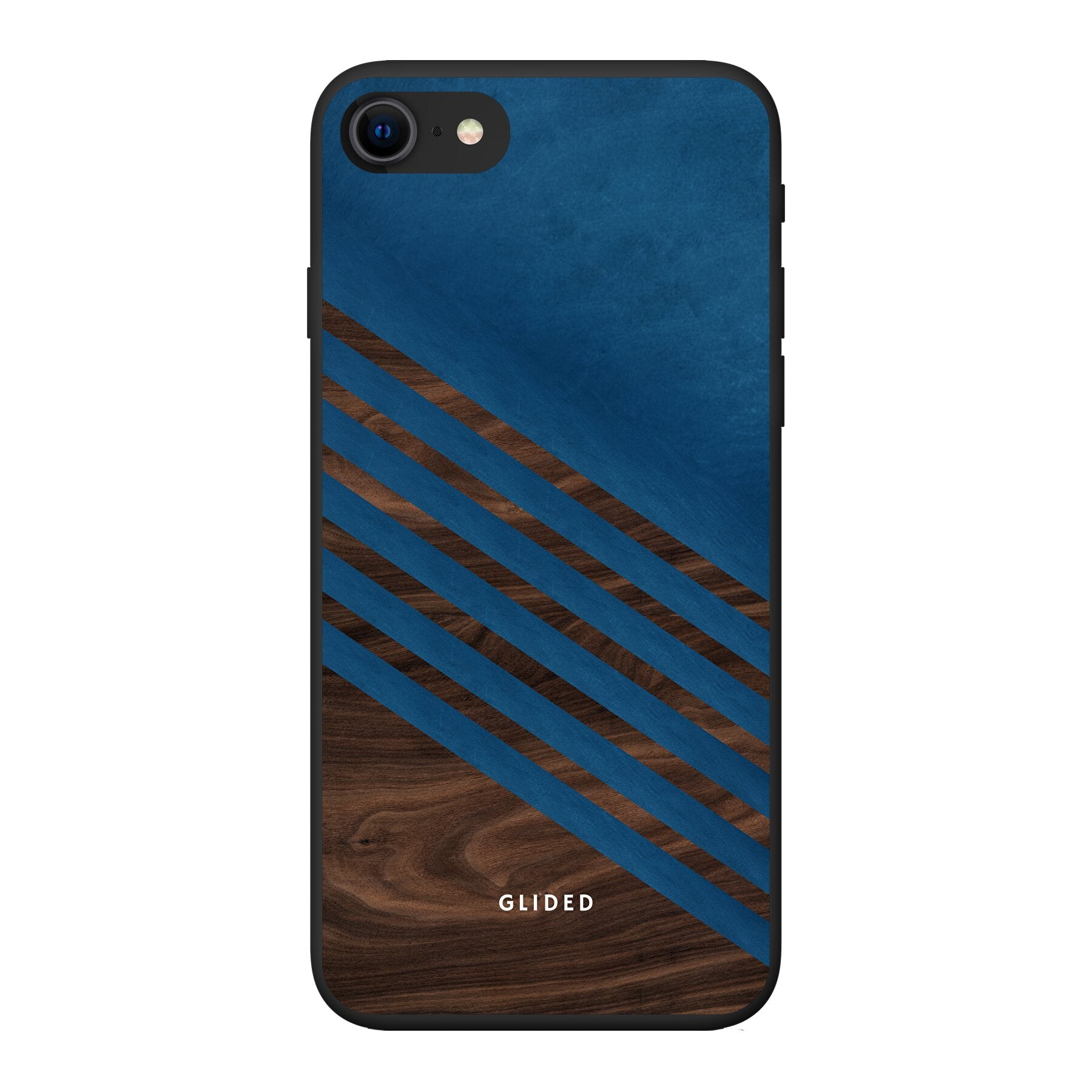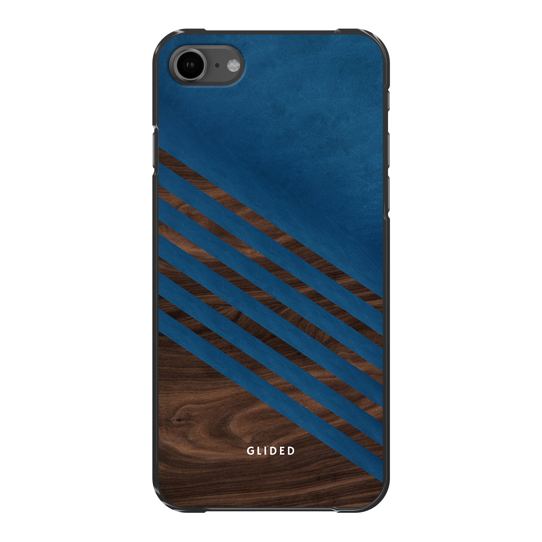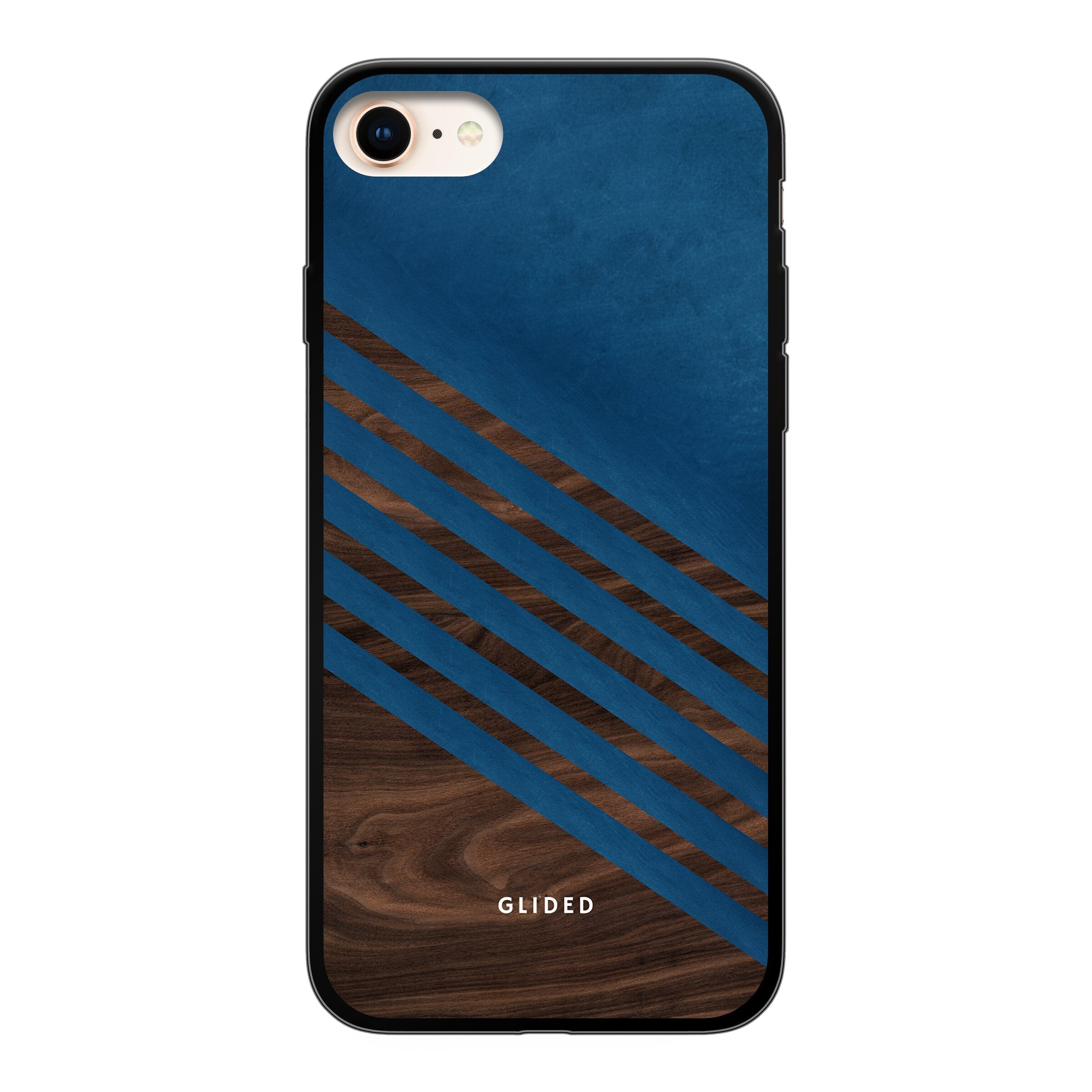 Die 'Blue Wood' iPhone 7 Handyhülle zeigt ein klassisches Holzmuster mit einem markanten dunkelblauen Farbblock, ideal für stilvollen Schutz.