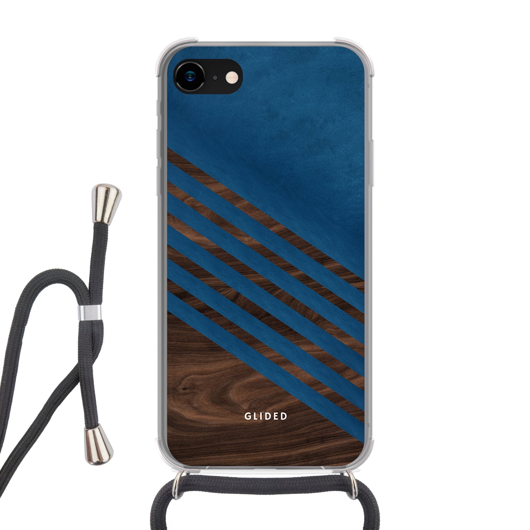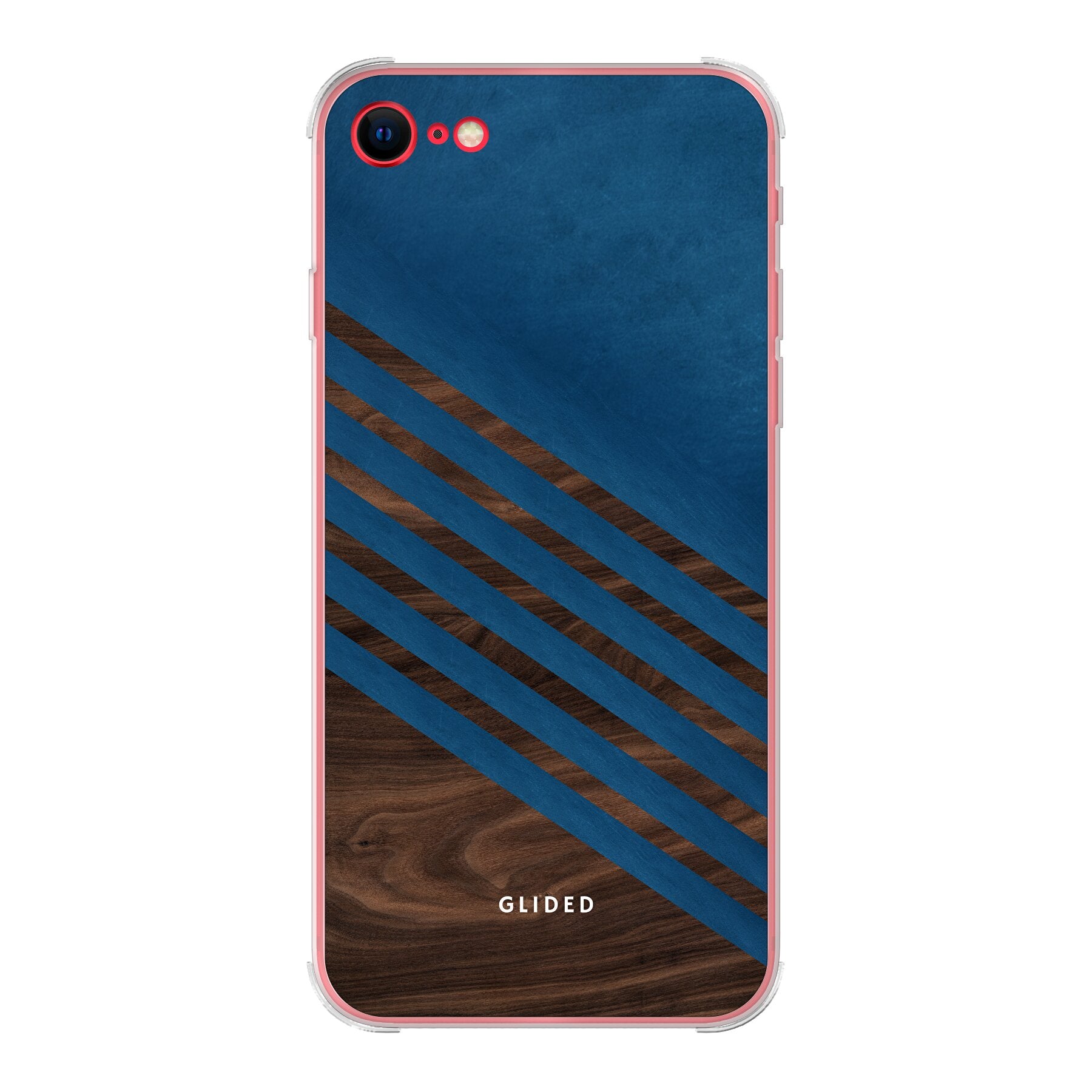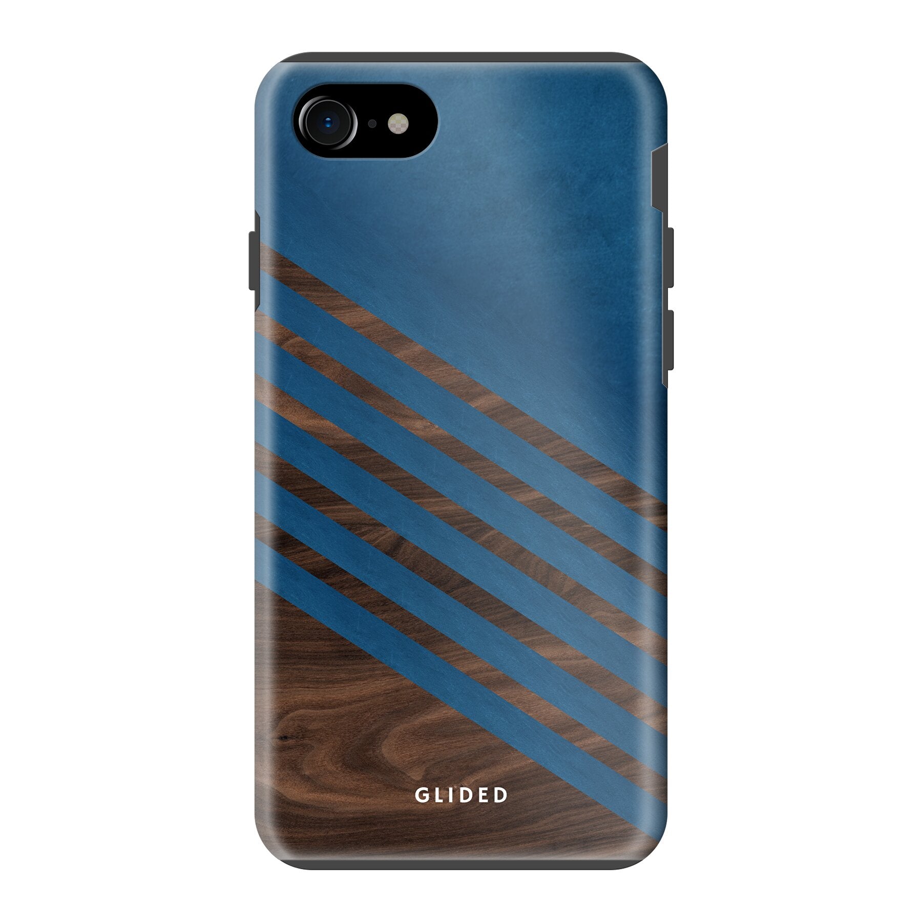Die 'Blue Wood' iPhone 7 Handyhülle zeigt ein klassisches Holzmuster mit einem markanten dunkelblauen Farbblock, ideal für stilvollen Schutz.
