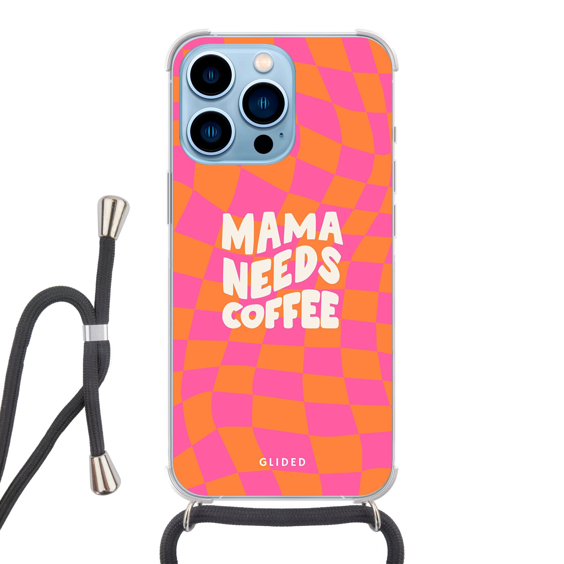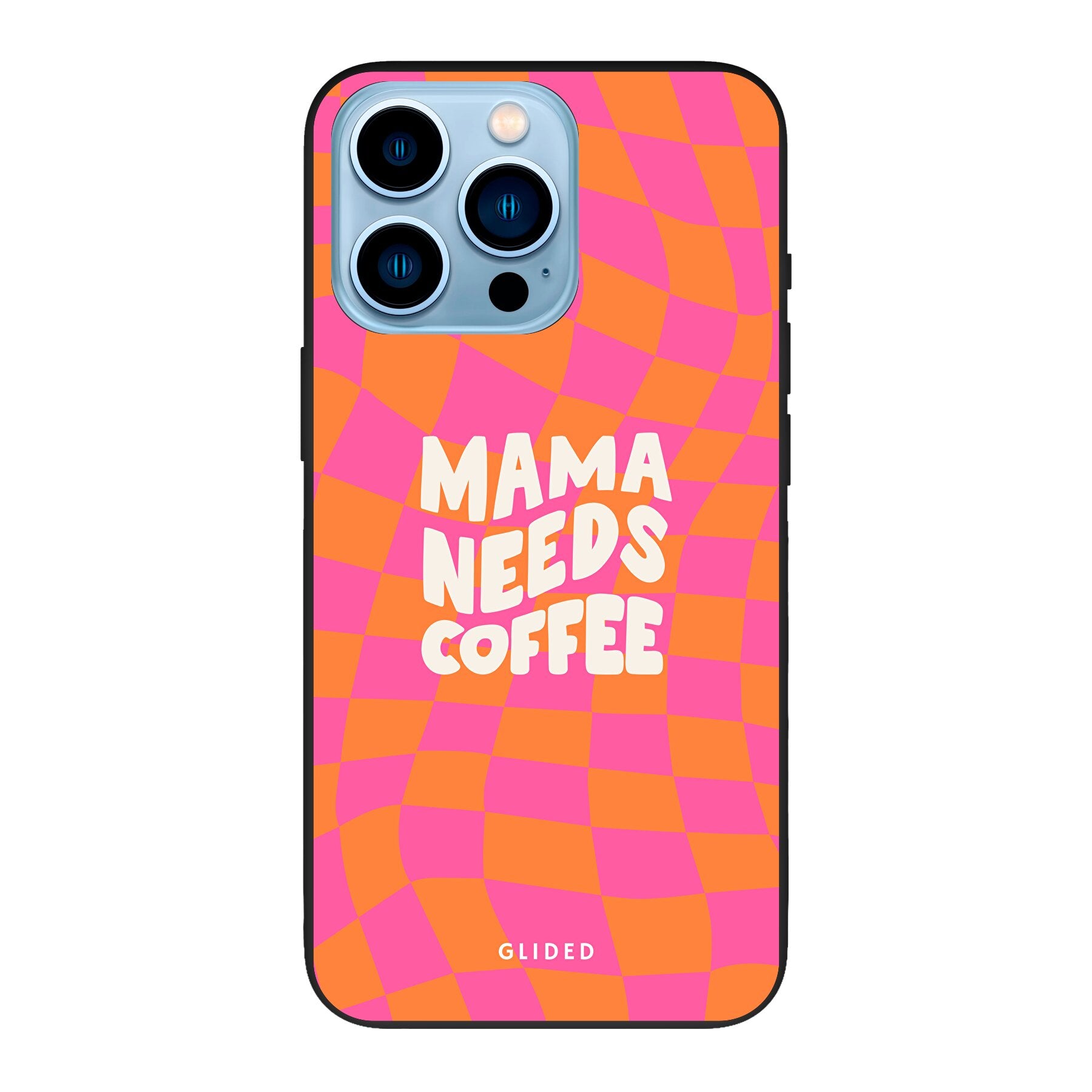 Coffee Mom iPhone 13 Pro Max Handyhülle mit Schachbrettmuster und dem Spruch 'Mama needs coffee'.