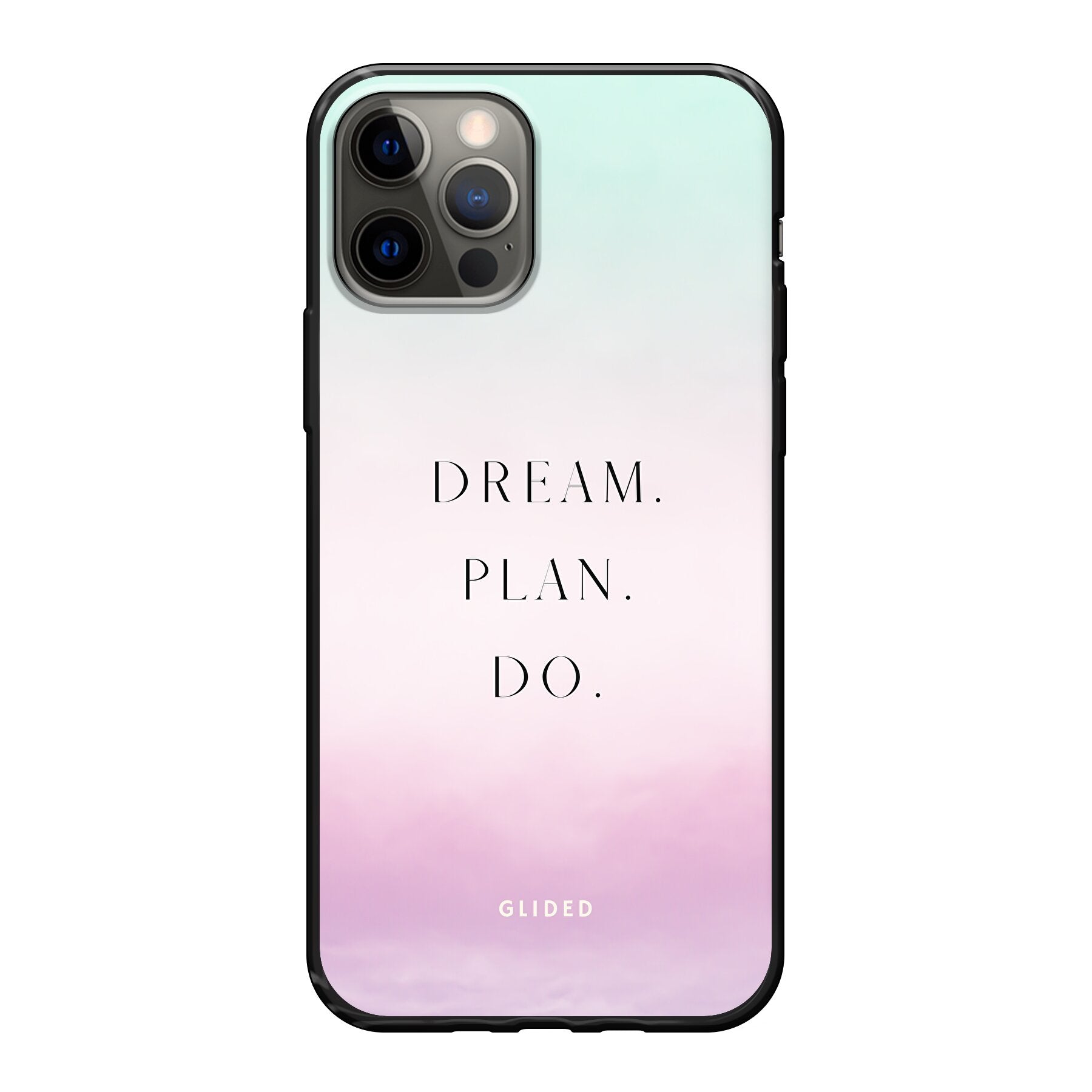 Dream iPhone 12 Handyhülle mit inspirierendem Spruch 'Dream, plan, do', stoßfestem Design und präzisen Aussparungen für Anschlüsse.