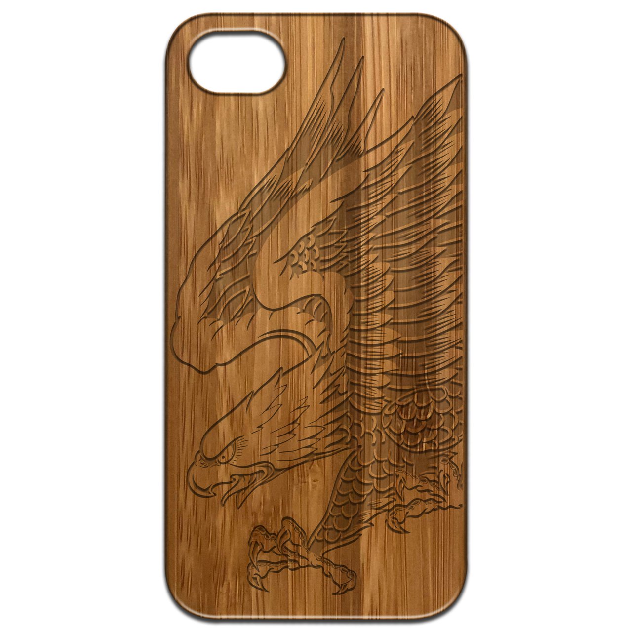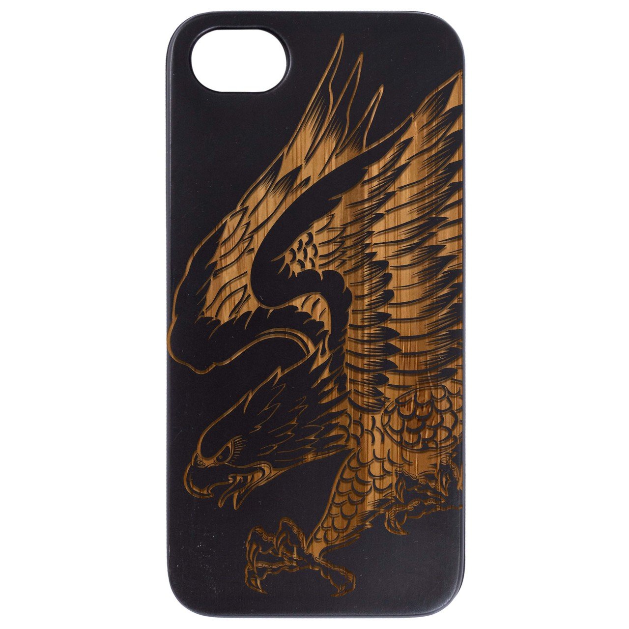 Eagle Attack - Engraved wooden phone case showcasing intricate laser-engraved design and natural wood finish.