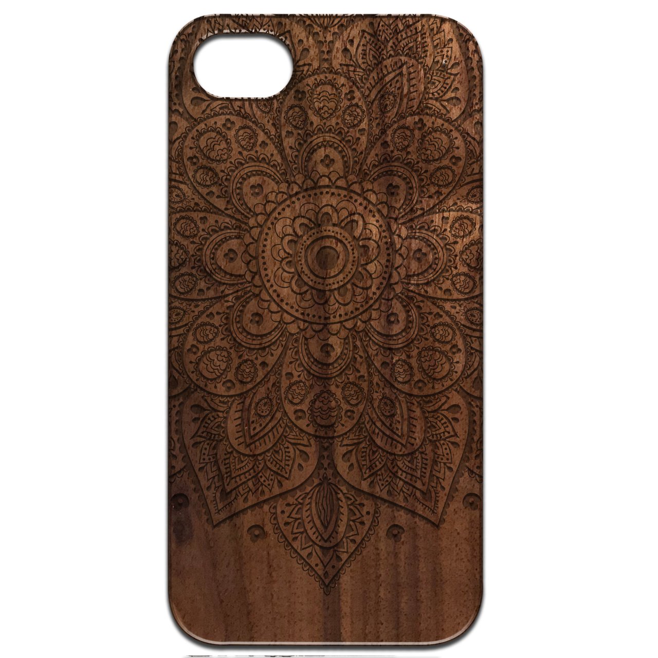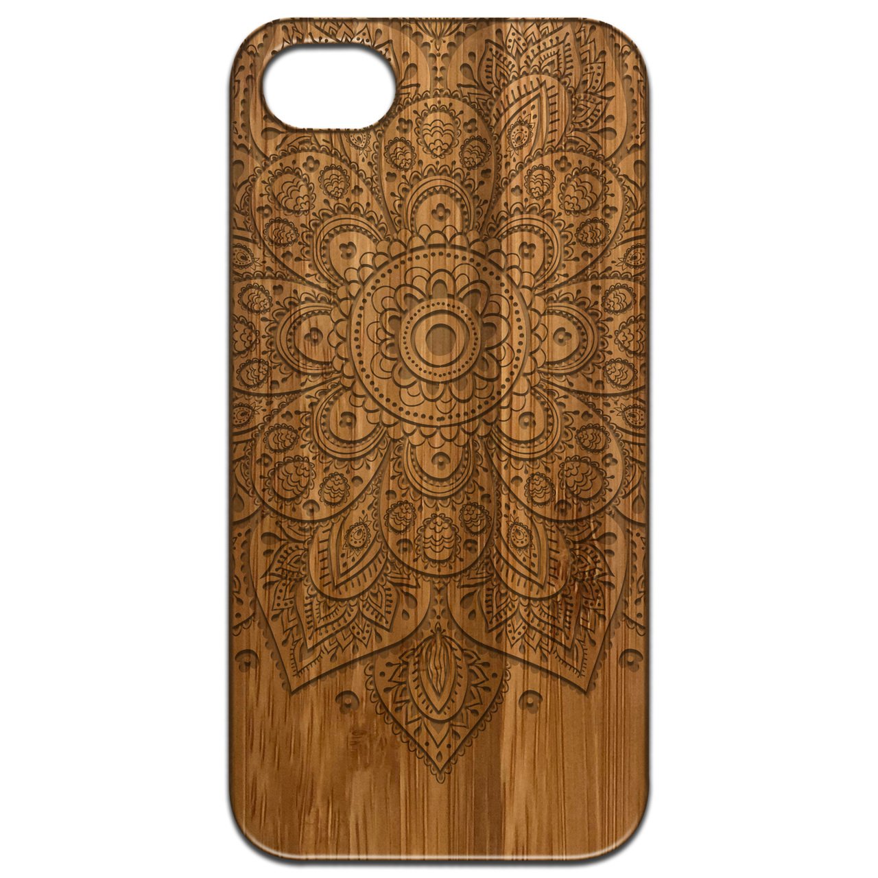 Floral Mandala 1 - Engraved wooden phone case featuring intricate floral designs, showcasing natural wood texture and stylish edges.