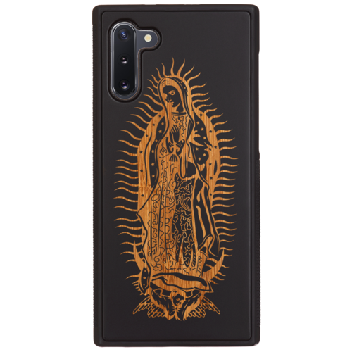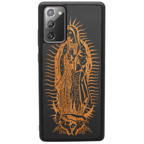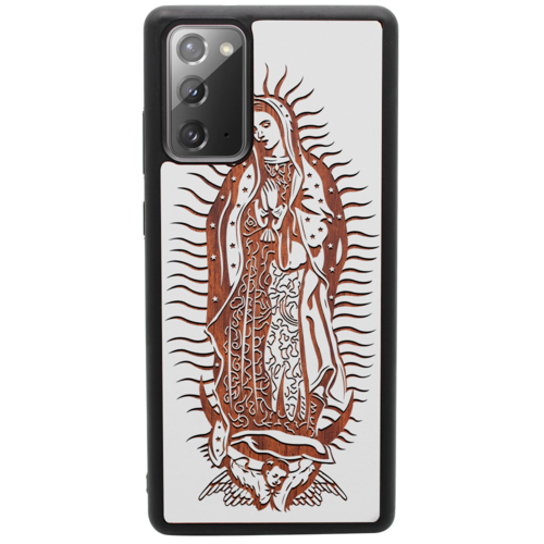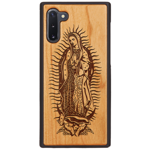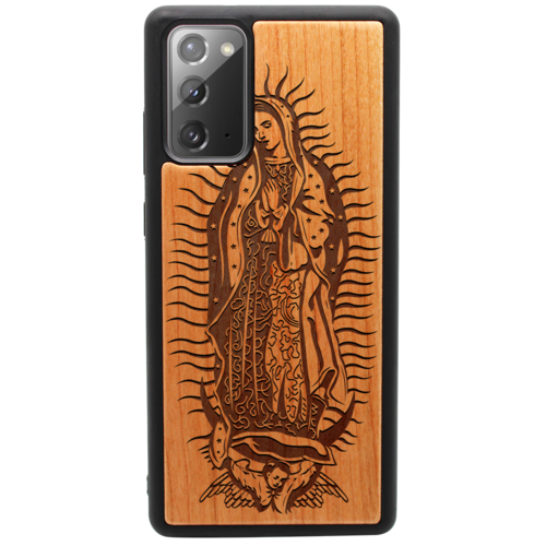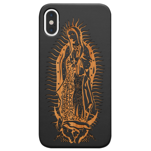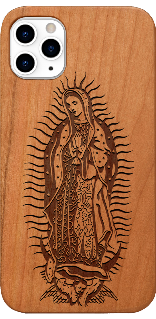 Guadalupe Engraved wooden phone case showcasing intricate laser-engraved designs and natural wood finish.