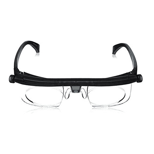 Adjustable glasses comprising 2 movable parts per lens. Turn the dials to adjust for distance or reading instantly.