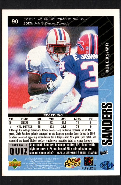 The Chris Sanders Houston Oilers #90 card from the 1996 Upper Deck Collector's Choice series is a remarkable collectible for any sports enthusiast. This trading card features Chris Sanders, a notable player who made his mark in the National Football League (NFL) while playing for the Houston Oilers. The card is part of the 1996 season set, which is known for its quality and design, making it a sought-after item among collectors. Upper Deck, a reputable name in the trading card industry, produced this card, ensuring that it meets high standards of quality and craftsmanship. The card is standard size, making it easy to store and display alongside other cards in your collection. As a non-autographed card, it remains accessible for collectors who appreciate the beauty of the card itself rather than the signature. The card is printed in English and was manufactured in the United States, adding to its authenticity and appeal. Collecting sports trading cards is a popular hobby, and the Chris Sanders card is a fantastic addition for anyone looking to enhance their collection. Whether you are a long-time collector or just starting, this card represents a piece of NFL history and the legacy of the Houston Oilers. The 1996 Upper Deck Collector's Choice set is particularly notable for its vibrant imagery and player statistics, which are often cherished by fans. Chris Sanders, known for his speed and agility on the field, is a player who has left a lasting impression on the game, making this card even more valuable to fans of the sport. The card's condition is not specified, but it is important to note that the value of trading cards can vary significantly based on their condition, rarity, and demand. As you consider adding this card to your collection, think about how it fits into your overall theme or focus. Many collectors enjoy building sets from specific years or teams, and the 1996 Upper Deck Collector's Choice series is a great choice for those interested in the NFL. This card can also serve as a conversation starter among fellow collectors and sports fans, showcasing your passion for the game and its history. In addition to being a collectible, this card can also be a thoughtful gift for a friend or family member who is a fan of the Houston Oilers or Chris Sanders. Trading cards often hold sentimental value, and gifting one can create lasting memories. As you explore the world of sports trading cards, remember that each card tells a story, and the Chris Sanders Houston Oilers #90 card is no exception. It captures a moment in time from the 1996 NFL season and represents the excitement of football culture. Whether you choose to display it in a protective case, include it in a scrapbook, or simply keep it in a box for safekeeping, this card is sure to bring joy to any sports fan. Don't miss the opportunity to own a piece of NFL memorabilia that celebrates the legacy of Chris Sanders and the Houston Oilers. This card is not just a trading card; it's a piece of sports history that can be cherished for years to come.