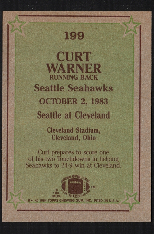 The Curt Warner Seattle Seahawks #199 card from the 1984 Topps set is a must-have for any serious football card collector or Seattle Seahawks fan. This trading card captures a moment in NFL history, showcasing Curt Warner, a legendary running back who made significant contributions to the Seahawks during his career. Warner was known for his speed, agility, and ability to break tackles, making him a standout player in the league. The card features Warner in his iconic Seahawks uniform, ready to take on the competition on the field. As part of the 1984 Topps set, this card is not only a piece of memorabilia but also a representation of the era of football during the 1980s. The card is in excellent condition, free from major flaws or defects, which is crucial for collectors who value the quality and preservation of their items. It comes from a smoke-free home, ensuring that it has been kept in an environment that maintains its integrity. Collecting trading cards has become a popular hobby, and the demand for vintage cards like this one continues to grow. The 1984 Topps set is particularly sought after, as it features many notable players from that time, making it a valuable addition to any collection. Whether you are a long-time collector or just starting, adding the Curt Warner Seattle Seahawks #199 card to your collection is a fantastic investment. It not only holds sentimental value for fans of the Seahawks but also represents a significant piece of NFL history. The card number 199 is a unique identifier that makes it easy for collectors to catalog their collections and find specific cards they are looking for. This card is perfect for display, whether in a protective case or as part of a larger collection. It can also serve as a great gift for any football enthusiast or collector in your life. With the NFL season in full swing, now is the perfect time to enhance your collection with this iconic card. Don't miss out on the opportunity to own a piece of football history that celebrates one of the greats of the game. The Curt Warner Seattle Seahawks #199 card is not just a trading card; it's a connection to the past and a celebration of the sport that millions love. Make sure to secure this card before it's gone, as items like this tend to sell quickly among collectors. Whether you are looking to invest, display, or gift, this card is an excellent choice that will surely be appreciated by any football fan.