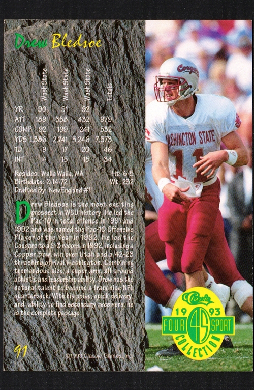 In summary, the Drew Bledsoe Washington State Cougars #91 card from the 1993 Classic Four Sport collection is a fantastic addition to any sports memorabilia collection. Its combination of quality, historical significance, and aesthetic appeal makes it a standout piece that any fan would be proud to own. Whether you are looking to enhance your collection or find the perfect gift for a sports enthusiast, this card is an excellent choice that embodies the spirit of college football and the legacy of Drew Bledsoe.