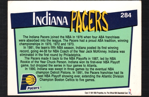 The Indiana Pacers Basketball Card #284 from the 1991-92 Hoops series is a must-have for any serious sports trading card collector. This standard-sized trading card showcases the Indiana Pacers, a team with a rich history in the National Basketball Association (NBA). The card was manufactured in the United States in 1991, making it a piece of memorabilia that reflects the era of basketball during the early 90s. The 1991-92 season was significant for the NBA, featuring many legendary players and memorable moments, and this card captures a slice of that history. Although this card is not autographed, its value lies in its rarity and the nostalgia it evokes for fans of the Indiana Pacers and basketball enthusiasts alike. Collectors appreciate cards like this for their historical significance and the connection they provide to the past. The card features English language text, making it accessible to a wide audience of collectors and fans. Whether you are looking to complete your collection or searching for the perfect gift for an Indiana Pacers fan, this card is an excellent choice. It represents not just a team, but a moment in time when basketball was evolving and gaining popularity across the United States. The Indiana Pacers have had their ups and downs over the years, but their loyal fan base continues to support them through thick and thin. Owning a piece of their history, such as this trading card, allows fans to feel connected to the team and its legacy. The 1991-92 Hoops series is known for its vibrant designs and quality production, making these cards highly sought after by collectors. Each card in the series tells a story, and card #284 is no exception. It serves as a reminder of the players who donned the Pacers jersey during that season and the exciting games they played. As you consider adding this card to your collection, think about the joy it will bring not only to you but also to fellow collectors and fans who appreciate the history of the NBA. The Indiana Pacers Basketball Card #284 is more than just a piece of cardboard; it is a collectible that embodies the spirit of basketball and the passion of its fans. Whether displayed in a protective case or stored in a binder, this card will surely be a highlight of any collection. Don't miss the opportunity to own this piece of sports history. The rarity of this card makes it a valuable addition to any trading card collection, and its connection to the Indiana Pacers adds to its appeal. As the NBA continues to grow and evolve, cards like this one serve as a bridge to the past, allowing fans to reminisce about the players and games that shaped the league. If you are a collector or a fan of the Indiana Pacers, this card is an essential item that deserves a place in your collection. Its historical significance and connection to the team make it a standout piece that will be cherished for years to come. The Indiana Pacers Basketball Card #284 from the 1991-92 Hoops series is not just a card; it is a piece of basketball history that captures the essence of the game and the passion of its fans.