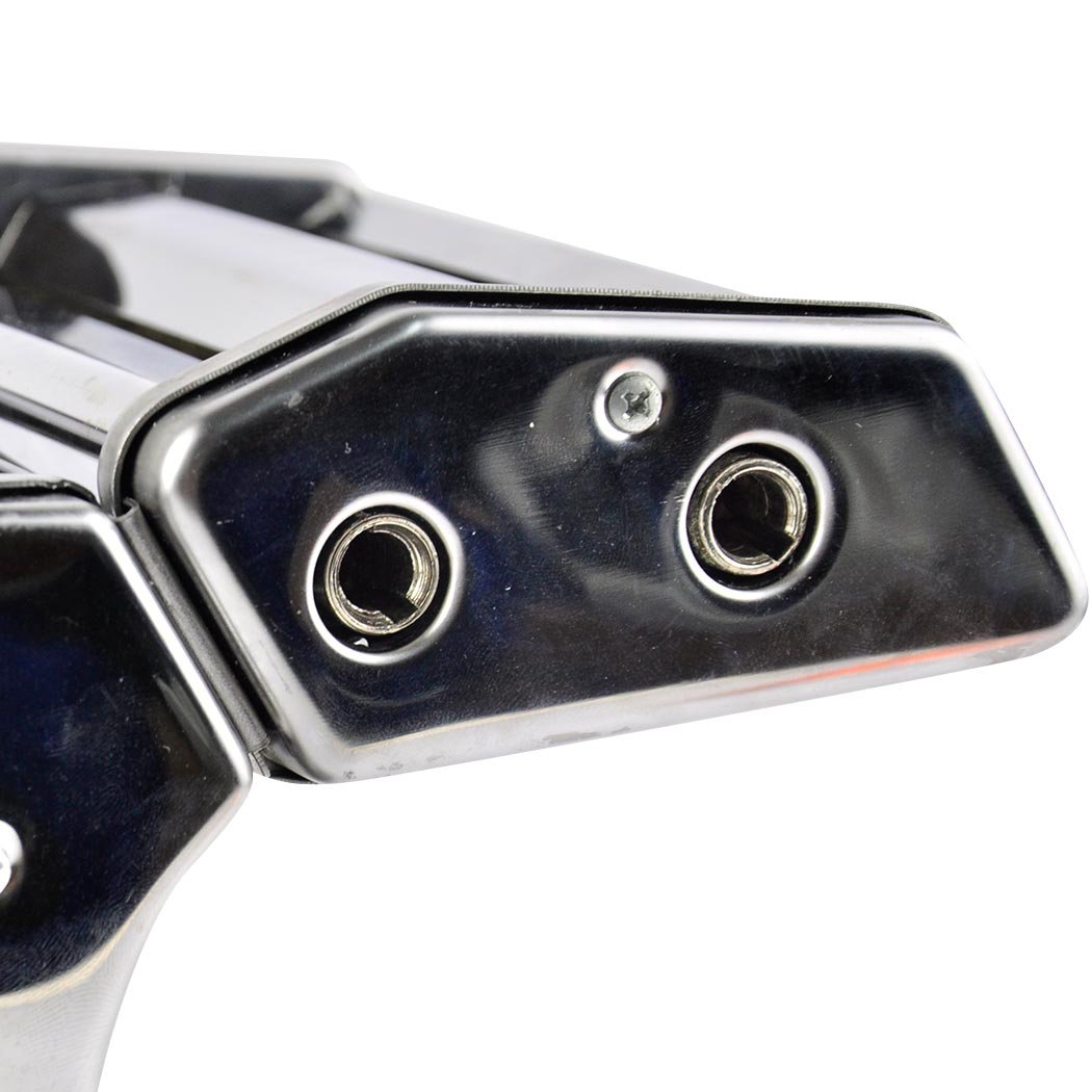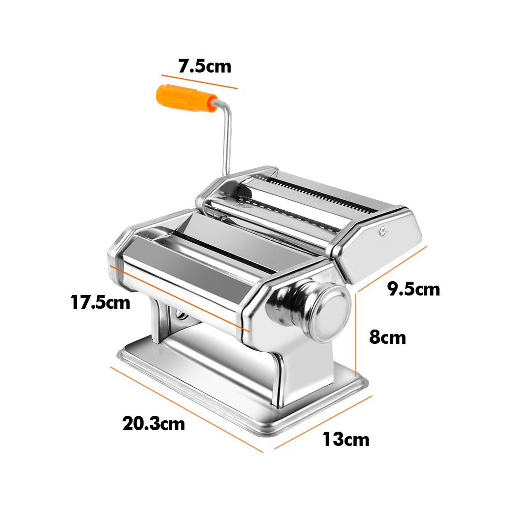 The pasta maker is made from top-quality chrome plated stainless steel, ensuring a sleek and modern appearance that will complement any kitchen decor. The dimensions of the machine are as shown in the product images, making it compact enough to fit in most kitchen spaces without taking up too much counter area.