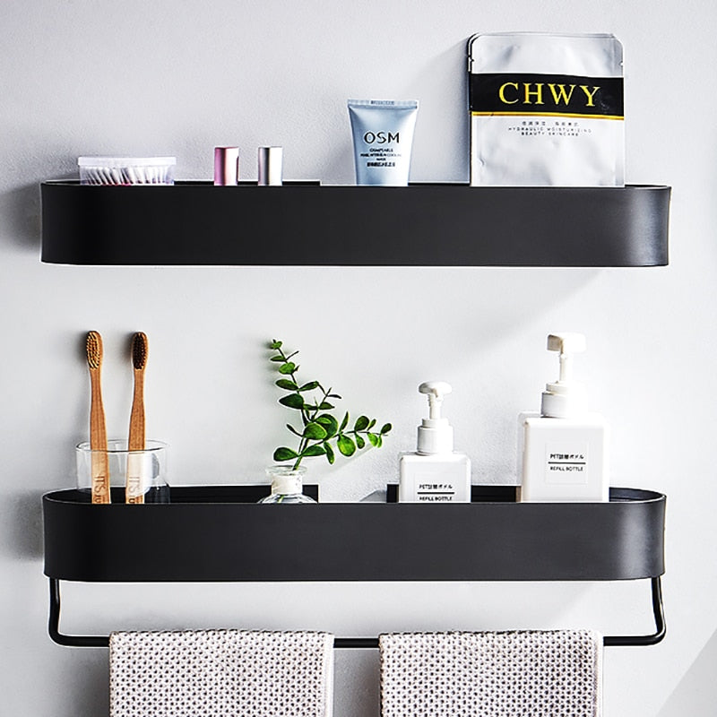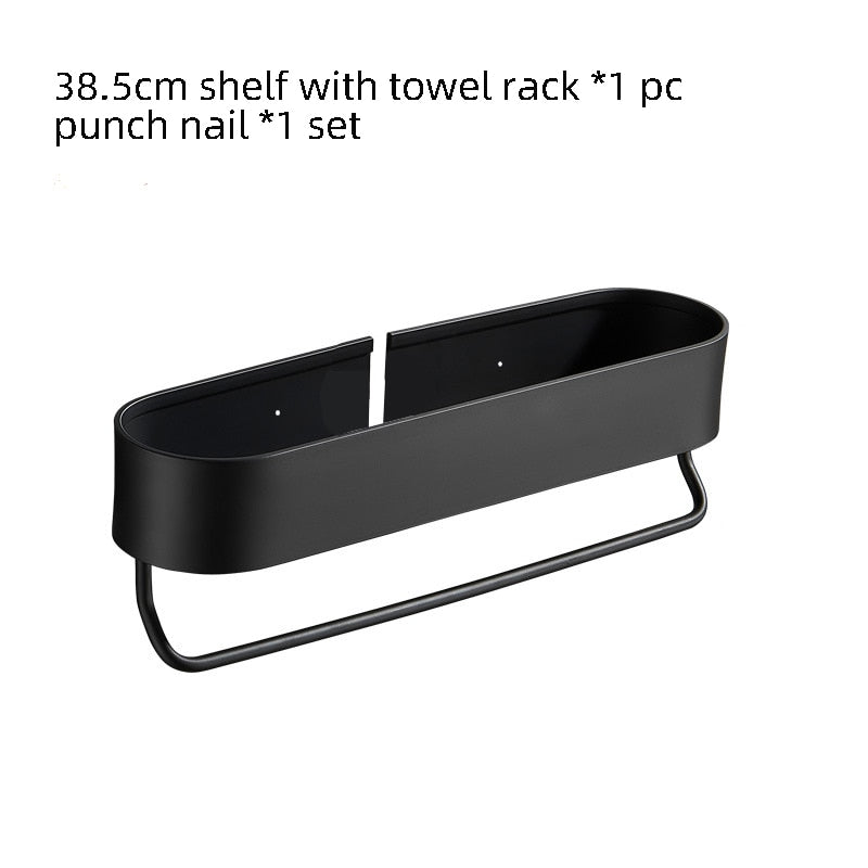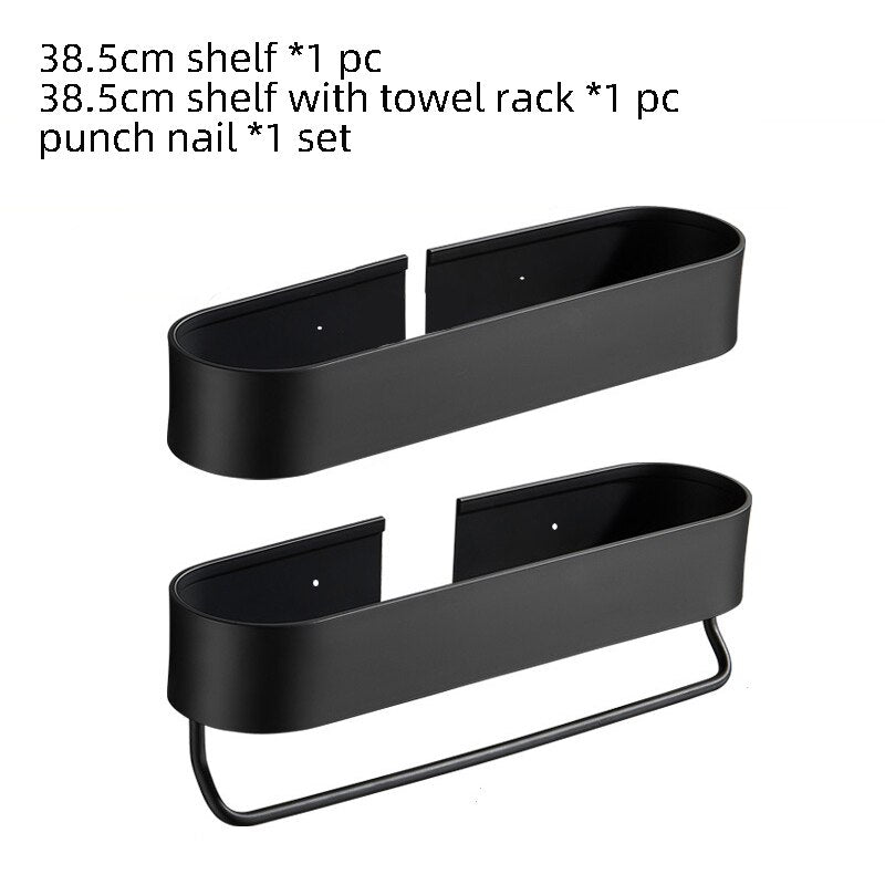 Introducing our Bathroom Shelf Rack Wall Mounted Shelves Bath Towel Holder in sleek black, designed to enhance your bathroom's functionality and aesthetics. This stylish shelf is made from high-quality aluminum alloy, ensuring durability and a modern look that complements any decor. Whether you're looking to organize towels, toiletries, or decorative items, this shelf provides the perfect solution.