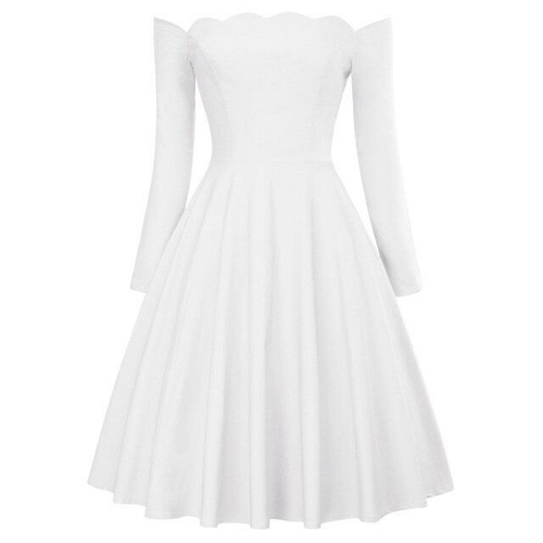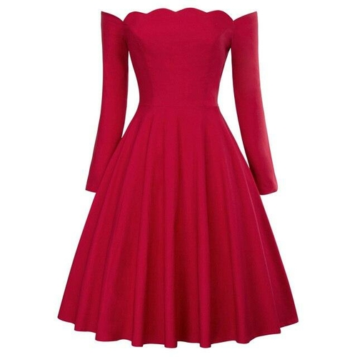 This dress features a unique off-shoulder neckline that adds a flirty touch to your look. The long sleeves provide warmth and comfort, making it suitable for winter wear. The flared A-line silhouette flatters all body types, allowing you to move freely while looking chic. The knee-length cut is versatile, making it easy to pair with your favorite boots or heels.
