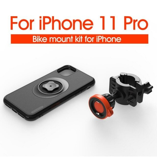 Bike handlebar mount holder with shockproof case for smartphones, securely holding an iPhone 11 Pro Max.