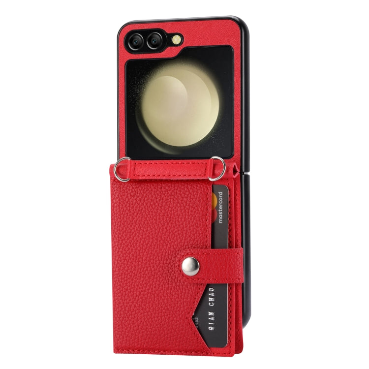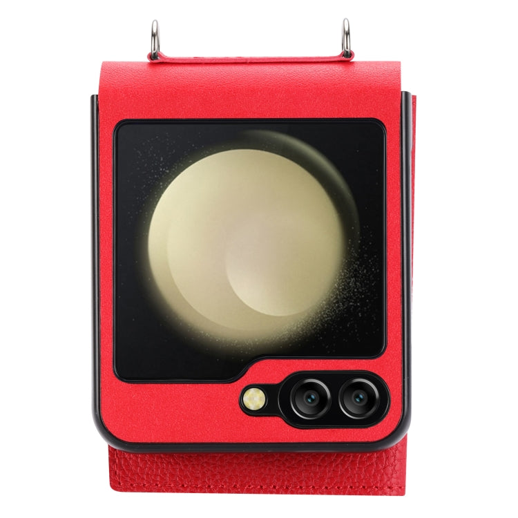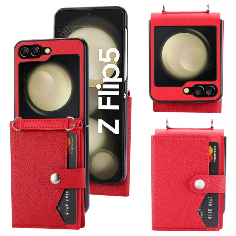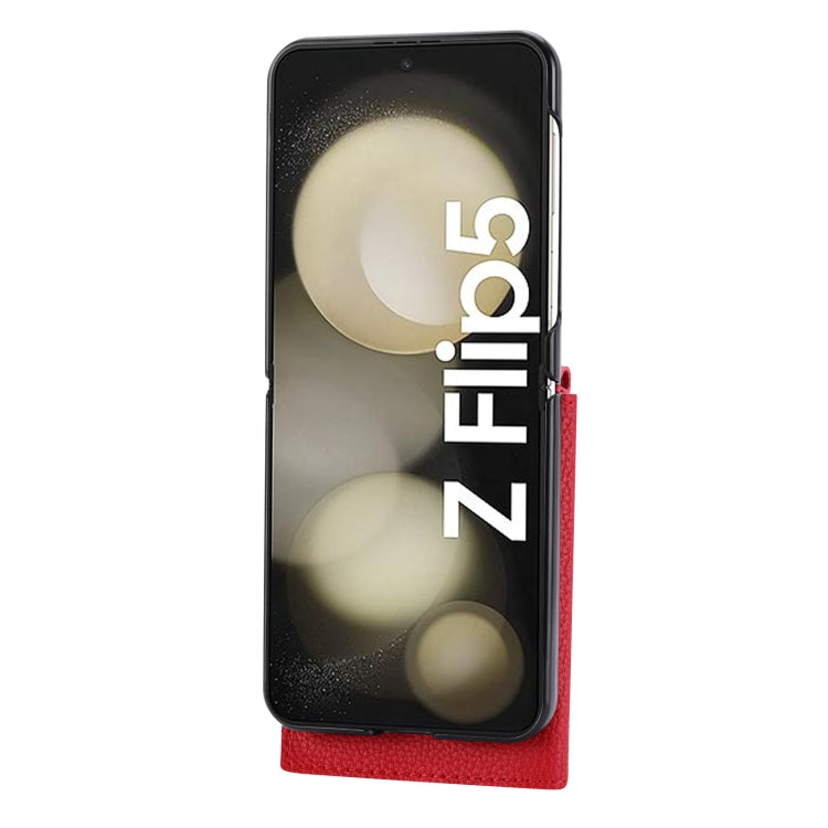 Introducing the For Samsung Galaxy Z Flip5 Litchi Pattern Single Button Card Holder, a perfect blend of style and functionality. This case is designed specifically for the Samsung Galaxy Z Flip5, ensuring a snug fit while providing essential protection against daily wear and tear. The litchi pattern glossy leather not only adds a touch of elegance but also enhances grip, making it comfortable to hold.