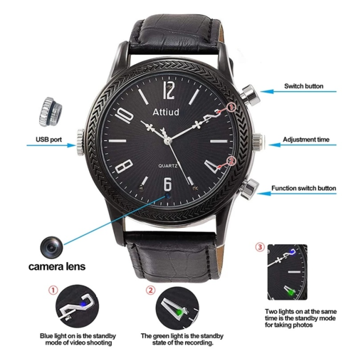 This camera looks like a men's watch, so no one will notice. In addition, it does not light up when it is working. With the built-in camera lens, you can use it to record what is happening. Enough quality so that you can see what is happening.