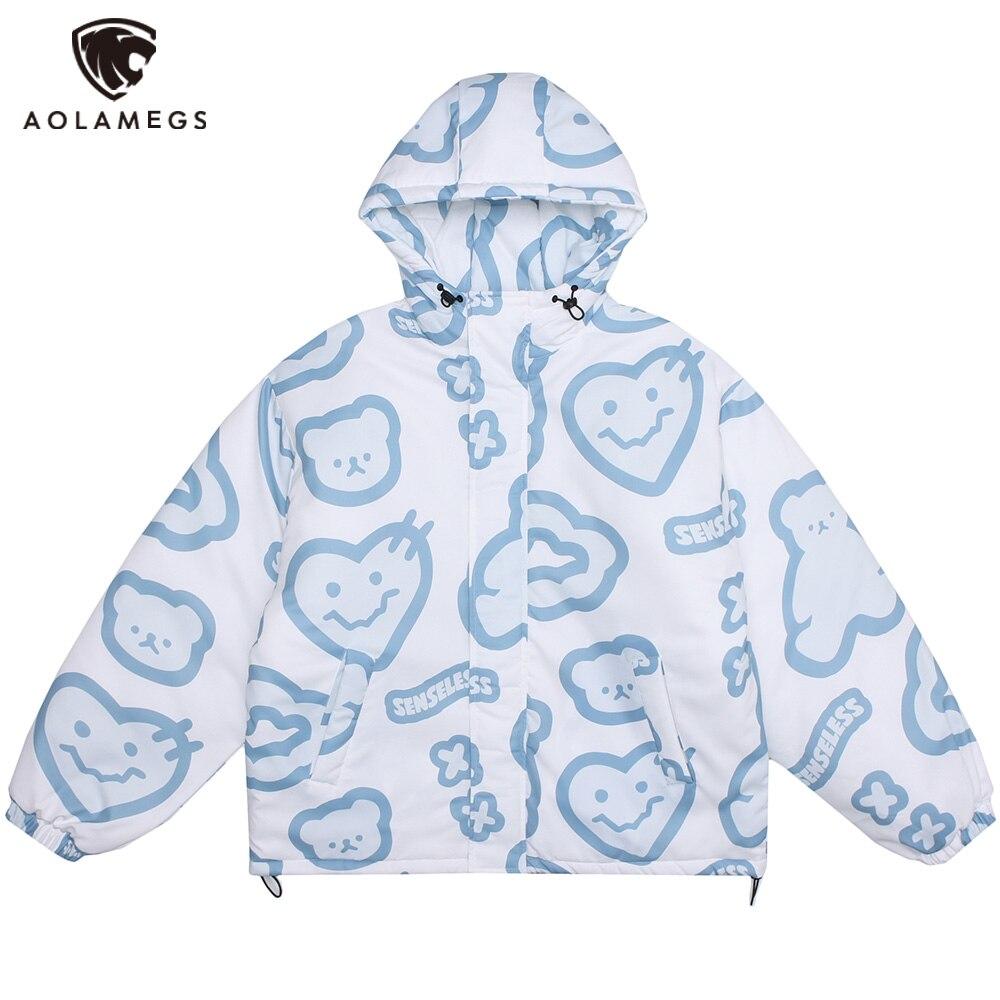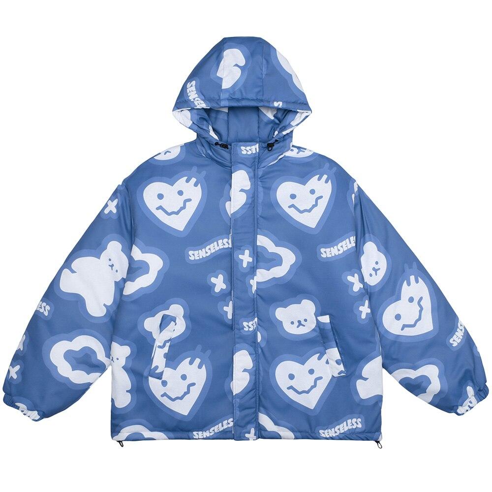 This jacket features a trendy oversized fit, making it a popular choice among fashion-forward individuals. The cartoon graphic print adds a playful touch, appealing to those who love to express their personality through their clothing. The hooded design not only enhances the style but also provides additional protection against the elements.