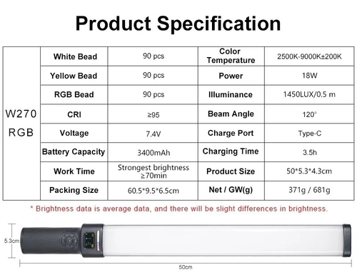 HRIDZ W270RGB Handheld RGB Stick Light 50CM 2500K-9000K Stick Light Bar with Charger Smart RGB Led Tube Light for Photography