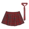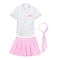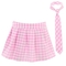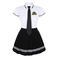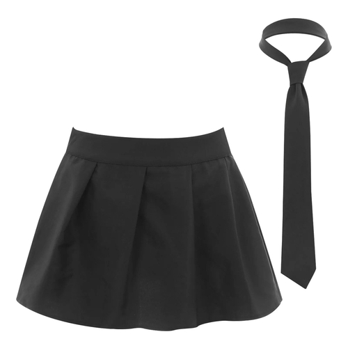 The short sleeve T-shirt features a classic turn-down collar and a front button closure, providing a polished look. The included black removable tie adds a touch of elegance and can be easily adjusted to suit your style. The matching pleated skirt is designed with an elastic band on both sides for a comfortable fit, while the back concealed zipper closure and button fastening ensure a secure and flattering silhouette.