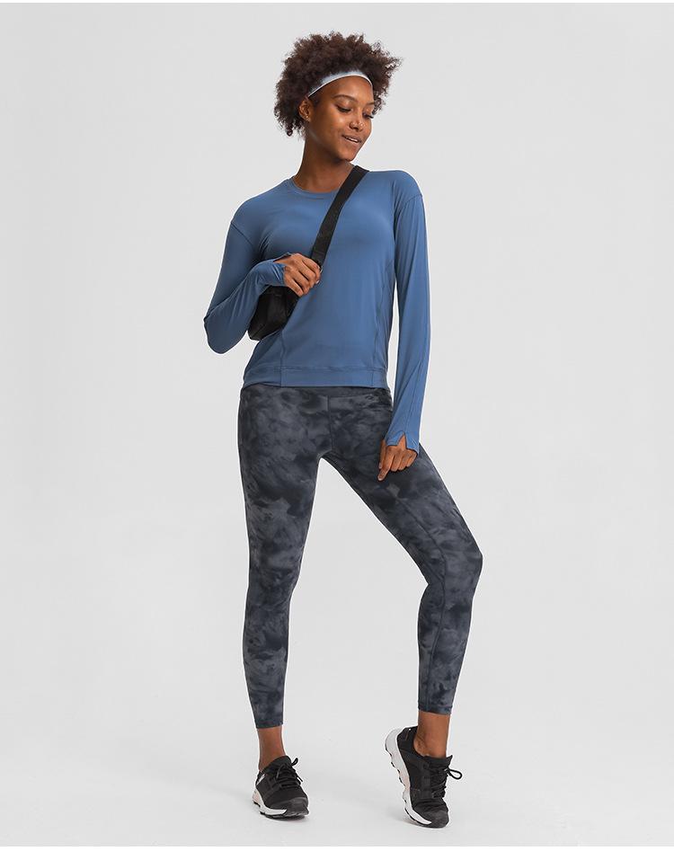 A lightweight long sleeve workout shirt for women, featuring a loose fit and thumb holes, ideal for yoga and fitness activities.