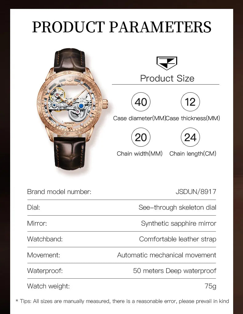 In summary, the JSDUN Men Mechanical Watch is an exceptional timepiece that combines luxury, durability, and functionality. With its automatic movement, waterproof capabilities, and elegant design, it is the perfect accessory for any occasion. Don't miss out on the opportunity to own this exquisite watch that reflects your style and sophistication.
