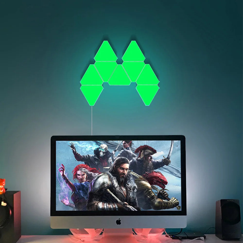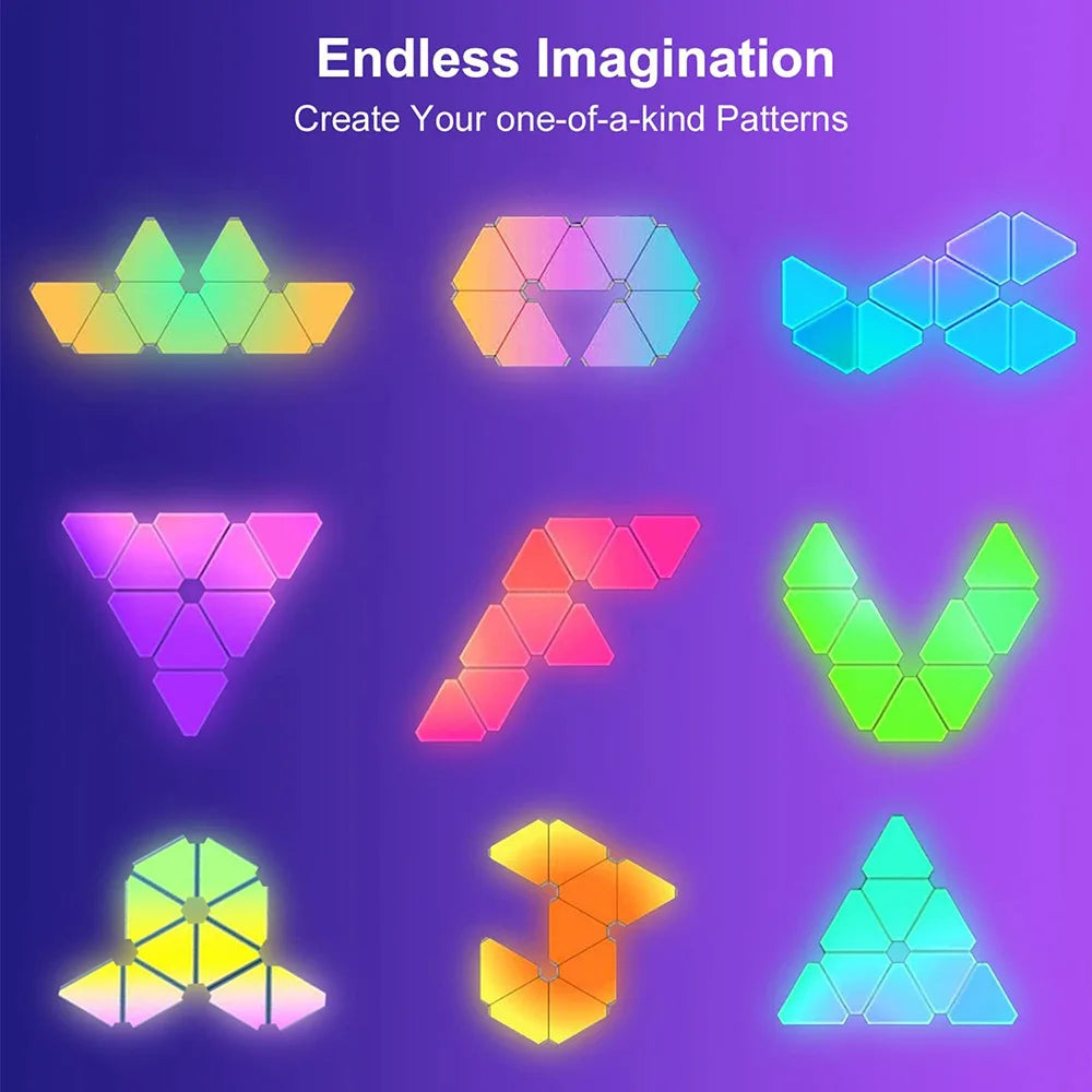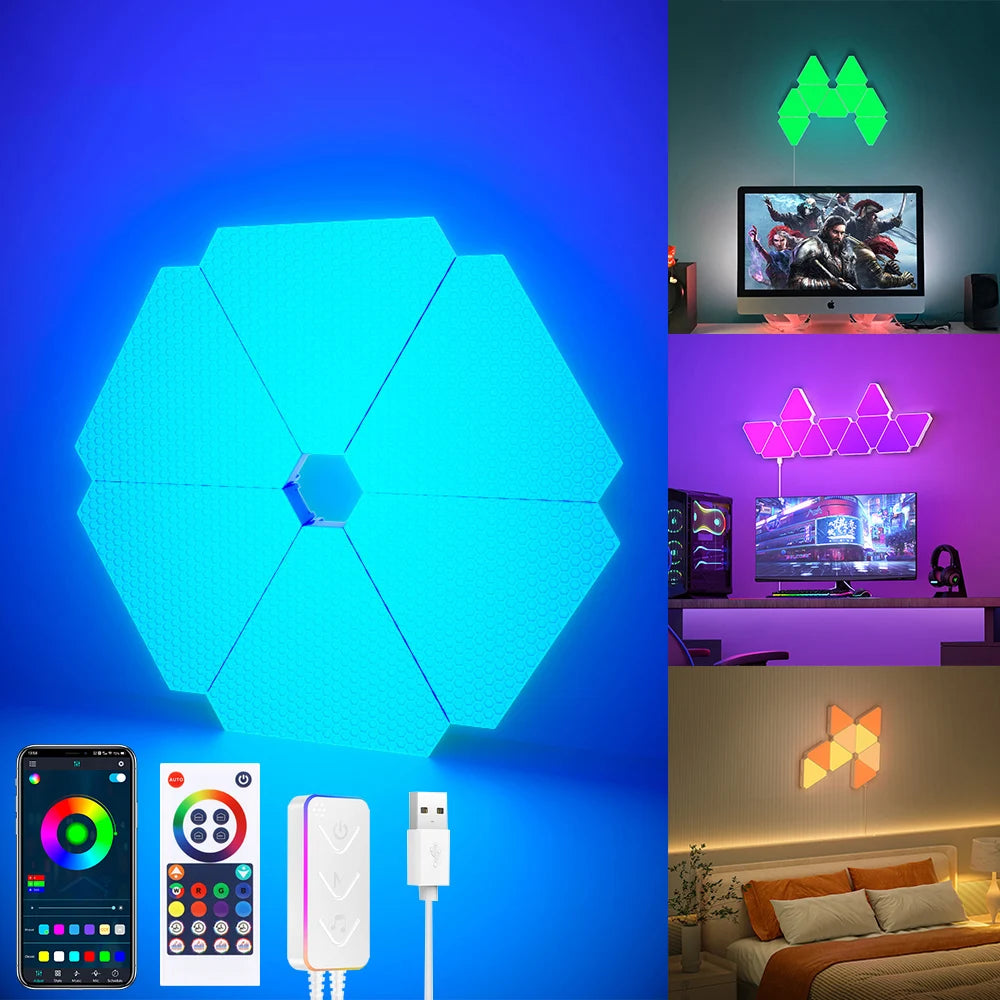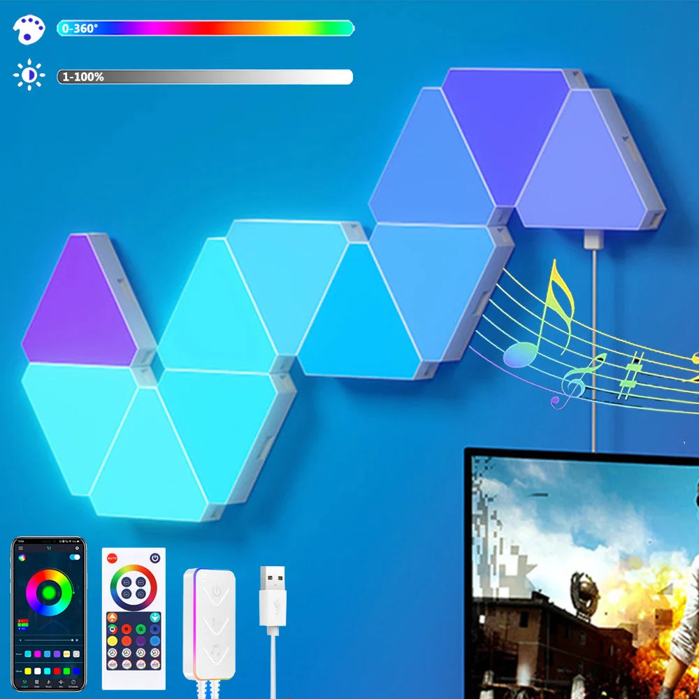 Enhance your living space with the innovative Remote LED Honeycomb Smart Modular Triangle Wall Sconces. These smart LED triangle lights are designed to bring a unique ambiance to any room, making them perfect for home decor or gaming setups. With their ability to sync with music and customizable color options, these wall sconces are not just lights; they are a statement piece for your home.