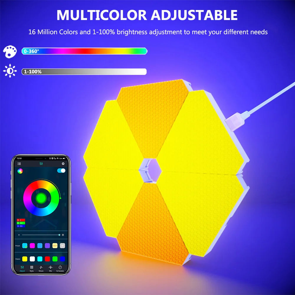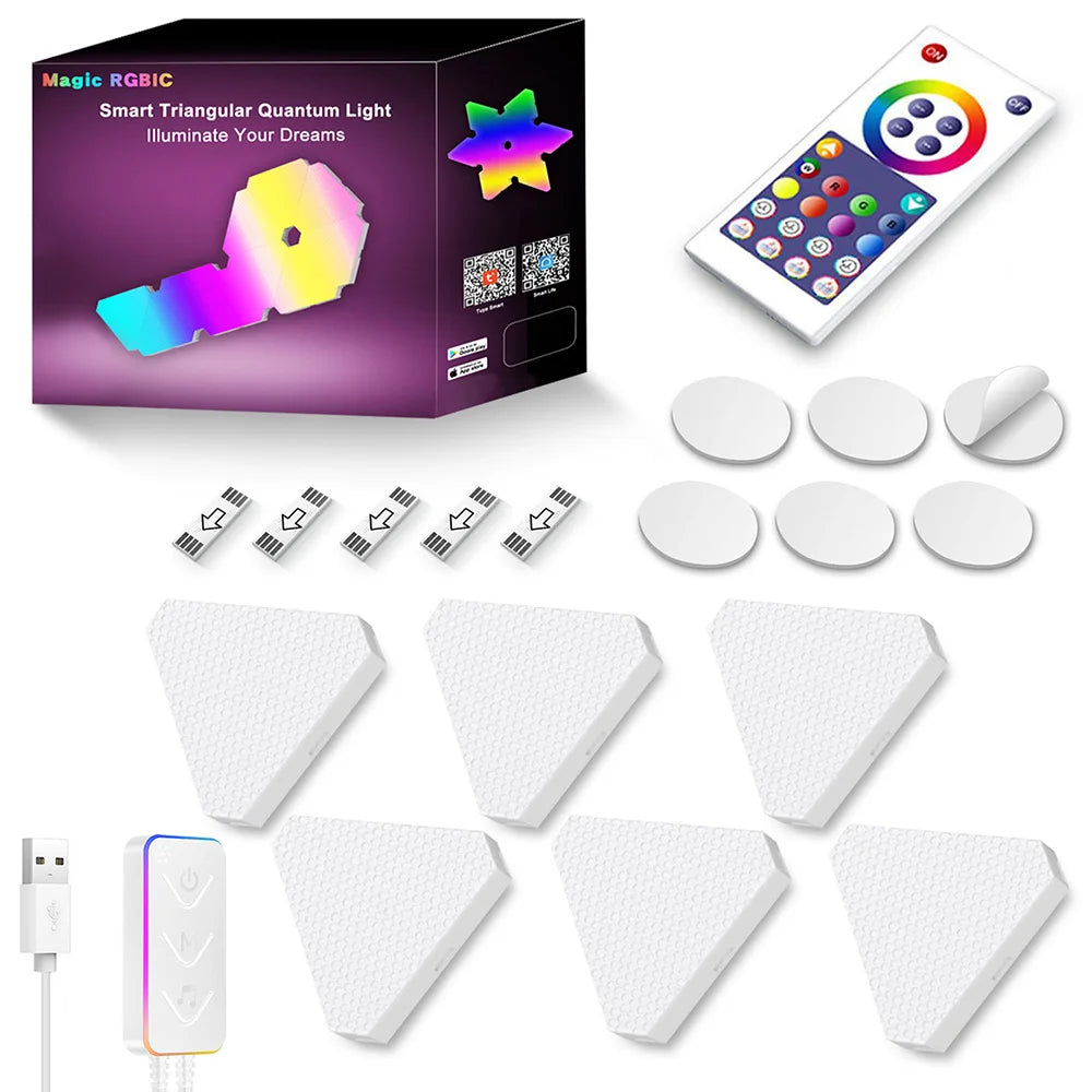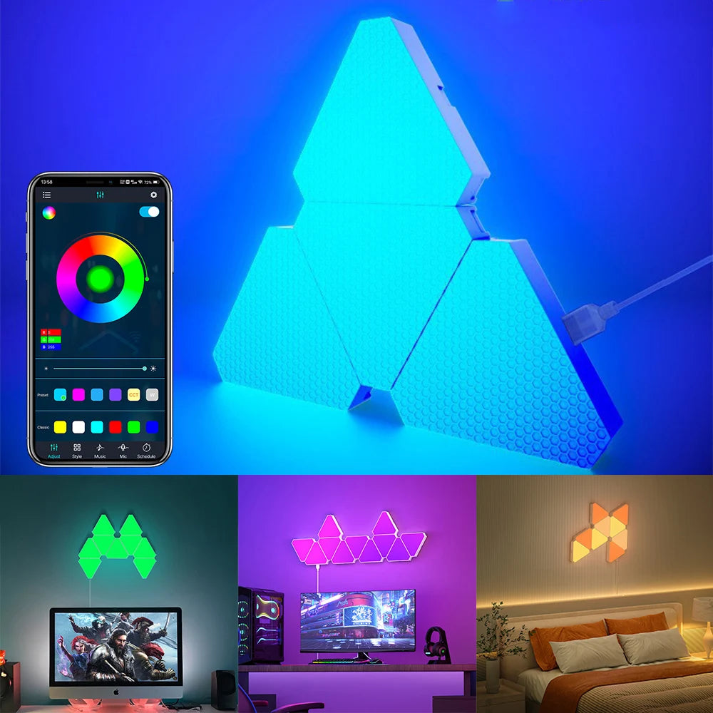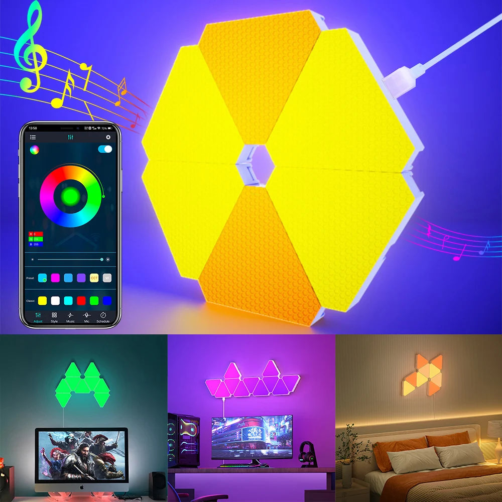Enhance your living space with the innovative Remote LED Honeycomb Smart Modular Triangle Wall Sconces. These smart LED triangle lights are designed to bring a unique ambiance to any room, making them perfect for home decor or gaming setups. With their ability to sync with music and customizable color options, these wall sconces are not just lights; they are a statement piece for your home.