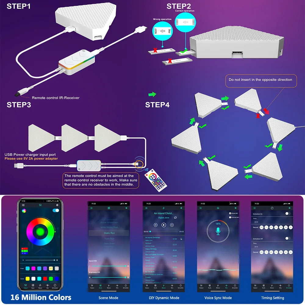 Equipped with an RGBIC chip, these triangle LED lights can display a stunning array of colors. With 16 million color options available, you can customize your lighting to match your mood or the theme of your room. The Dream Color animation feature allows for flowing multicolor effects that can transform any space into a vibrant environment. Use the included remote control to easily select your desired color and mode.