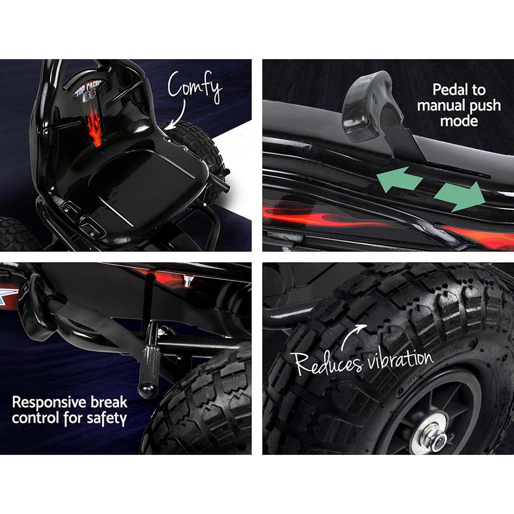 The go-kart features rubber pneumatic tyres with a diameter of 25cm, ensuring a smooth ride on various surfaces. The kart is easy to assemble, allowing you to set it up quickly for your child's enjoyment. The sleek black color adds a stylish touch, making it appealing to kids and parents alike.