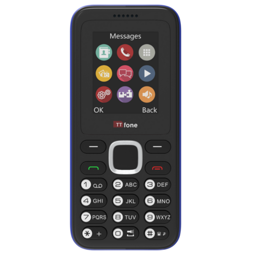 The TTfone TT150 Blue Dual Sim Cheap Mobile Phone for Emergency Use. It comes with a USB Cable, Vodafone Pay As You Go.