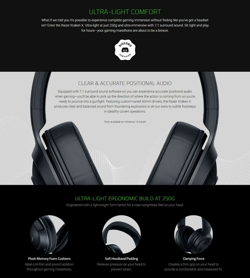 What if we told you it's possible to experience complete gaming immersion without feeling like you've got a headset on? Enter the Razer Kraken Essential X. Ultra-light at just 230g and ultra-immersive with 7.1 surround sound. Sit tight and play for hours-your gaming marathons are about to be a breeze.