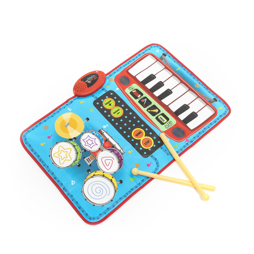 A versatile 2-in-1 musical mat with an original multicolour and multifunction design containing a keyboard with 4 instruments (piano, violin, accordion, saxophone) and drum kit with drums and cymbals. It also features optional backing tunes and includes 2 drumsticks for playing the drums. Ideal for 2 children to play together, as the drum kit and keyboard can be played at the same time. This musical mat is non-slip, robust and very easy to use. It switches on an off with the on/off button. The volume can be adjusted using the 2 volume buttons (+/-). The automatic backing tunes can be enabled and disabled with the DEMO/STOP buttons. It can be placed on any surface (floor, table, etc.) and can be played with the hands or feet. It is battery operated, lightweight, portable so it can be taken anywhere. A perfect gift and a fun way to get children started in the musical arts. It promotes cognitive development by encouraging observation, memory, imagination and thought. It improves interpersonal skills and balance. Recommended for children from the age of 3.